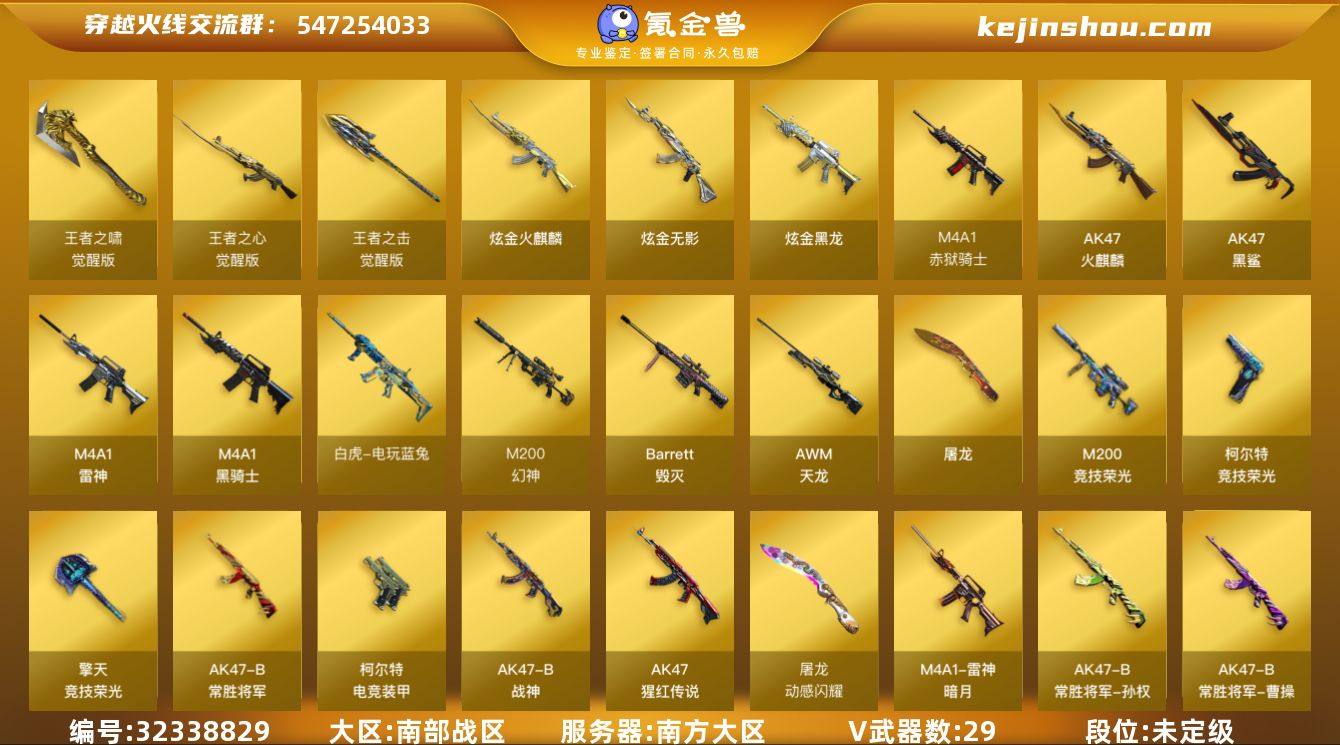 南方大区-44V-33王者武器数-3炫金武器数 【热门武器】:M200-幻神,M200-竞技荣光,白虎-电玩蓝兔,M4A1-黑骑士 【王者炫金武器】:炫金火麒麟,炫金无影,炫金黑龙,王者之魄高爆手雷,王者之魄闪光弹*3 【音效卡】:M200-幻神音效卡,M4A1-黑骑士音效卡 【皮肤】:幻神-周瑜皮肤,幻神-丹凤,幻神-青鹤,金色蔷薇-电竞之星 皮肤,雷神-暗月,火麒麟-平天大圣,火麒麟-白虎,毁灭-星空,毁灭-魔灵皮肤,毁灭-虹光风暴 皮肤,毁灭-定军扬威 皮肤,战神-粉色甜心皮肤,战神-紫绶金章皮肤,战神-流金岁月皮肤*2,AK47-B-常胜将军-曹操,AK47-B-常胜将军-刘备,AK47-B-常胜将军-孙权 【角色】:电竞教官-云悠悠,王者-零-国色天香,王者涂鸦,王者玲珑,修道士,初恋灵狐,嘉年华灵狐,兰-海滩派对,0号玩家,灵狐者-X,麻雀,潘多拉-甜心教官,莎莎 【人偶武器】:星神-炽天使,AWM-灵狐-15周年嘉年华,M37-葵,闪光弹-貂蝉,高爆手雷-大乔 【英雄级武器】:AK47-火麒麟,M4A1-雷神,M4A1-黑骑士,AK47-黑鲨,王者之心-觉醒版,王者之戮-觉醒版,AK-47-猩红传说,AK47-B-战神,王者冰魄-觉醒版,AK47-B-常胜将军,M4A1-雷霆王者-觉醒版,白虎-电玩蓝兔,AWM-天龙,Barrett-毁灭...