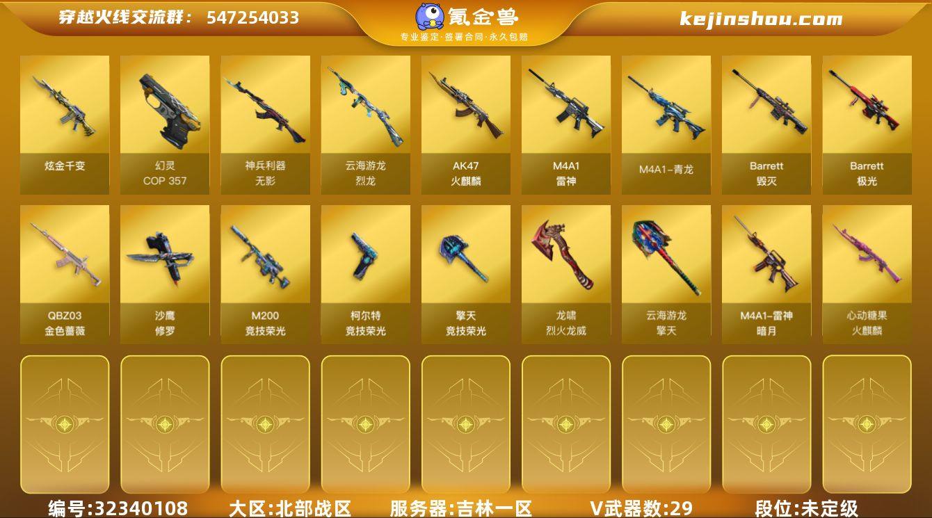 吉林一区-31V-0王者武器数-1炫金武器数 【热门武器】:QBZ03-金色蔷薇,M4A1-青龙,M200-竞技荣光,COP 357-幻灵,沙鹰-修罗 【王者炫金武器】:炫金千变 【音效卡】:Barrett-极光音效卡 【皮肤】:雷神-暗月,火麒麟-心动糖果,修罗-星空 【角色】:奇洋探员,乔伊教练,修道士,云海玲珑,初恋灵狐,芳心审判者,风暴女*2,虎妞,嘉年华灵狐,灵狐者-职业经理,龙儿,麻雀,潘多拉-X,斯沃特-X,新娜塔莎,雪莉杨-摸金校尉 【人偶武器】:白虎-迷你小艾,迷你牛牛 【暴走生化】:超级对讲机 【挑战大师】:激光毁灭者III-白马银枪 【英雄级武器】:AK47-火麒麟*2,M4A1-雷神*2,M4A1-青龙,无影-神兵利器,QBZ03-金色蔷薇,机械迷城-穹宇,Barrett-毁灭,Barrett-极光,M200-竞技荣光,烈龙-云海游龙,沙鹰-修罗,COP 357-幻灵,柯尔特-竞技荣光,擎天-竞技荣光,擎天-云海游龙,龙啸-烈火龙威,高爆手雷-幻灵,高爆手雷-竞技荣光*2,手雷-云海游龙,闪光弹-幻灵,闪光弹-竞技荣光*2,烟雾弹-幻灵,烟雾弹-竞技荣光*3 【源级武器】:源·天龙,魂·裁决-新人王绿豆,魂·修罗-现代金属,魂·屠龙-春桃,魂·麒麟刺-神秘黑洞 【道具】:云海游龙炫彩背包,冰冰企鹅背包-猛男专用...
