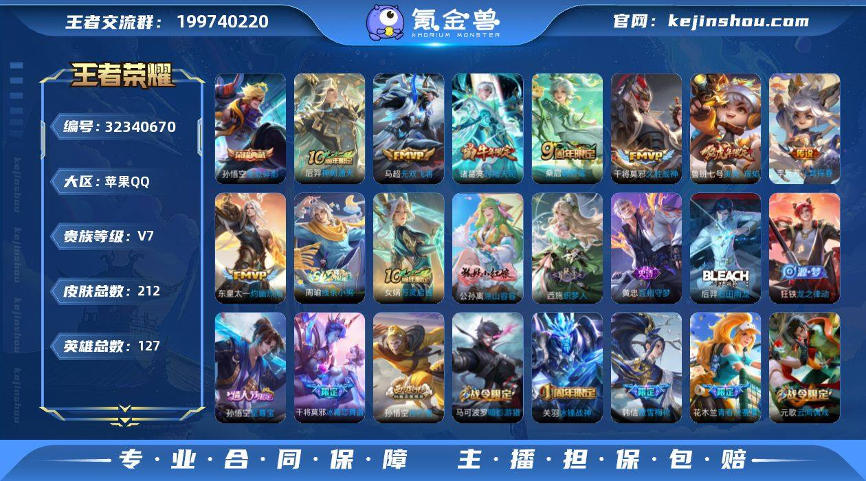 账号亮点:马超神骥逐星野,后羿神树通天,云缨幻光神枪,桑启鸣野蒿,朵莉亚心动手记,赵云乘龙铭钟鼎,澜逐花归海,李白诗剑行,孙尚香音你闪耀,达摩黄金狮子座,宫本武藏地狱之眼,孙悟空地狱火,狄仁杰超时空战290-8 【传说皮肤】:马超神骥逐星野,后羿神树通天,云缨幻光神枪,桑启鸣野蒿,朵莉亚心动手记,赵云乘龙铭钟鼎,澜逐花归海,李白诗剑行,孙尚香音你闪耀,达摩黄金狮子座,宫本武藏地狱之眼,孙悟空地狱火,狄仁杰超时空战士 【限定皮肤】:姜子牙天穹之誓,狄仁杰阴阳师,赵云皇家上将,狄仁杰魔术师,项羽海滩派对,孙悟空孙行者,李元芳云中旅人,钟馗神迹守卫,鬼谷子五谷丰年,裴擒虎擒涛扼浪,鲁班大师探海日志,桑启海盐诗旅,鬼谷子天穹祈灯,赵云乘龙铭钟鼎,沈梦溪龙舞盛年,刘邦剑破天穹,镜青焰无极,项羽苍威无极,朵莉亚心动手记,刘备异域游侠,周瑜熔金海岸 【年限皮肤】:赵云乘龙铭钟鼎 【赛季限定】:李元芳云中旅人,桑启海盐诗旅,裴擒虎擒涛扼浪,鲁班大师探海日志,鬼谷子天穹祈灯,刘邦剑破天穹,姜子牙天穹之誓,钟馗虚灵犬护,甄姬逆浪荇歌,亚瑟荣光之誓 【战令限定】:钟馗神迹守卫,镜青焰无极,项羽苍威无极,周瑜线条小狗 【史诗皮肤】:钟馗锁墨魂,明世隐百晓客,周瑜线条小狗,女娲万灵启世,黄忠百相守梦,狂铁龙之律动,弈星万物之道,镜青焰无极,鬼谷子五谷丰年,司马懿暗渊魔法,孙悟空孙行者,橘右京修罗,狄仁杰鹰眼统帅,阿轲节奏热浪,李元芳逐浪之夏,刘禅天才门将,铠曙光守护者,兰陵王暗隐猎兽者,小乔缤纷独角兽,花木兰水晶猎龙者,韩信白龙吟,吕布末日机甲,李白千年之狐,妲己女仆咖啡,妲己魅力维加斯,孙尚香水果甜心,宫本武藏鬼剑武藏,狄仁杰魔术师,王昭君偶像歌手,貂蝉圣诞恋歌,赵云皇家上将 【其他皮肤】:艾琳鹤鸣心笺,亚瑟荣...