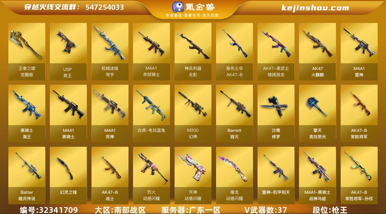 广东一区-41V-2王者武器数-0炫金武器数 【热门武器】:M200-幻神,白虎-电玩蓝兔,M4A1-黑骑士,沙鹰-修罗 【王者炫金武器】:王者之魄高爆手雷 【音效卡】:AK47-火麒麟音效卡 【皮肤】:M200-幻神-黄忠皮肤,雷神-烈虎皮肤,雷神-机甲刑天皮肤,雷神-源计划2.0专属 皮肤,雷神-蓝风铃 皮肤,火麒麟-AG战队皮肤,火麒麟-百城,火麒麟-心动糖果,毁灭-魔灵皮肤,毁灭-神秘黑洞皮肤,黑骑士-战神马超,AK47-B-常胜将军-曹操,AK47-B-常胜将军-刘备,AK47-B-常胜将军-孙权,炼狱-星空 【角色】:零·纪元,乔伊教练,修道士,初恋灵狐,芳心审判者,风暴女,虎妞,嘉年华灵狐,葵-赛博朋克,灵狐者-黄金海岸,灵狐者-七夕宝贝,龙儿-小淘气,潘多拉-甜心教官,斯沃特-X,兔囡囡,雪莉杨-摸金校尉,樱-战斗天使 【人偶武器】:AWM-灵狐-15周年嘉年华,迷你波特博士*3,夺魂,深渊终结者手雷,闪光弹-貂蝉,高爆手雷-大乔,迷你超能女侍 【暴走生化】:超级对讲机 【挑战大师】:冰龙粉碎者-白马银枪,激光毁灭者III-白马银枪*2,激光毁灭者III,试炼破坏者III,神圣爆裂者-末日III,惩戒者III 【英雄级武器】:AK47-火麒麟*2,M4A1-雷神,M4A1-黑骑士,M4A1-死神,无影-神兵利器,...