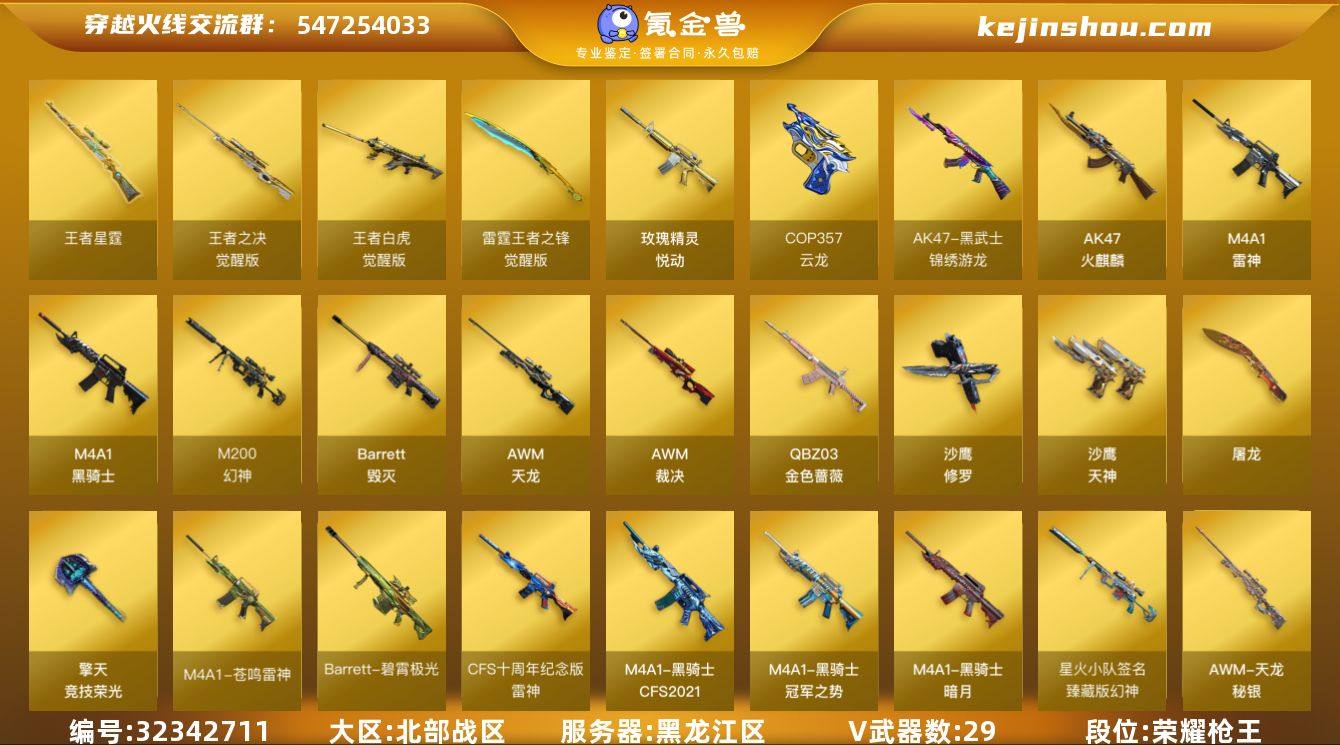 【ky5129】黑龙江区-31V-5王者-0炫金 【热门武器】:QBZ03-金色蔷薇*2,M200-幻神,死亡之眼,牛牛-AK47,M4A1-黑骑士,羊驼玩偶,沙鹰-修罗*2,Knife-冠军之刃 【王者炫金武器】:玫瑰精灵-悦动,王者星霆 【音效卡】:M4A1-黑骑士音效卡,Barrett-碧霄极光音效卡 【皮肤】:幻神-星火小队签名臻藏版 皮肤,幻神-电竞之星 皮肤,裁决-胜者为王 皮肤,雷神-CFS十周年纪念版 皮肤,雷神-春花弄影 皮肤,火麒麟-新春kwai乐,毁灭-暗月*2,毁灭-英雄计划 皮肤,黑骑士-暗月,黑骑士-冠军之势,黑骑士-CFS2021,天龙-秘银,修罗-能量核心,天神-暗月*2,擎天-冠军之击 【角色】:魅影,雪域霜狐,蛇隐宗,暗夜-X,芳心审判者,风暴女,0号玩家,零-热舞青春,灵狐者-X,潘多拉-X,潘多拉-甜心教官,蛇姬,樱-缤纷夏日 【人偶武器】:牛牛-AK47,夺魂,迷你火种 【暴走生化】:死亡之眼 【英雄级武器】:AK47-火麒麟,M4A1-雷神*2,M4A1-黑骑士,黑武士-锦绣游龙,QBZ03-金色蔷薇*2,王者白虎-觉醒版,AWM-天龙,Barrett-毁灭,AWM-裁决,M200-幻神,王者之决-觉醒版,沙鹰-修罗*2,沙鹰-天神*3,COP 357-云龙,屠龙*2,擎天-竞技荣光,雷霆王者之锋-觉醒版,高爆手雷-古蛇迷踪,烟...