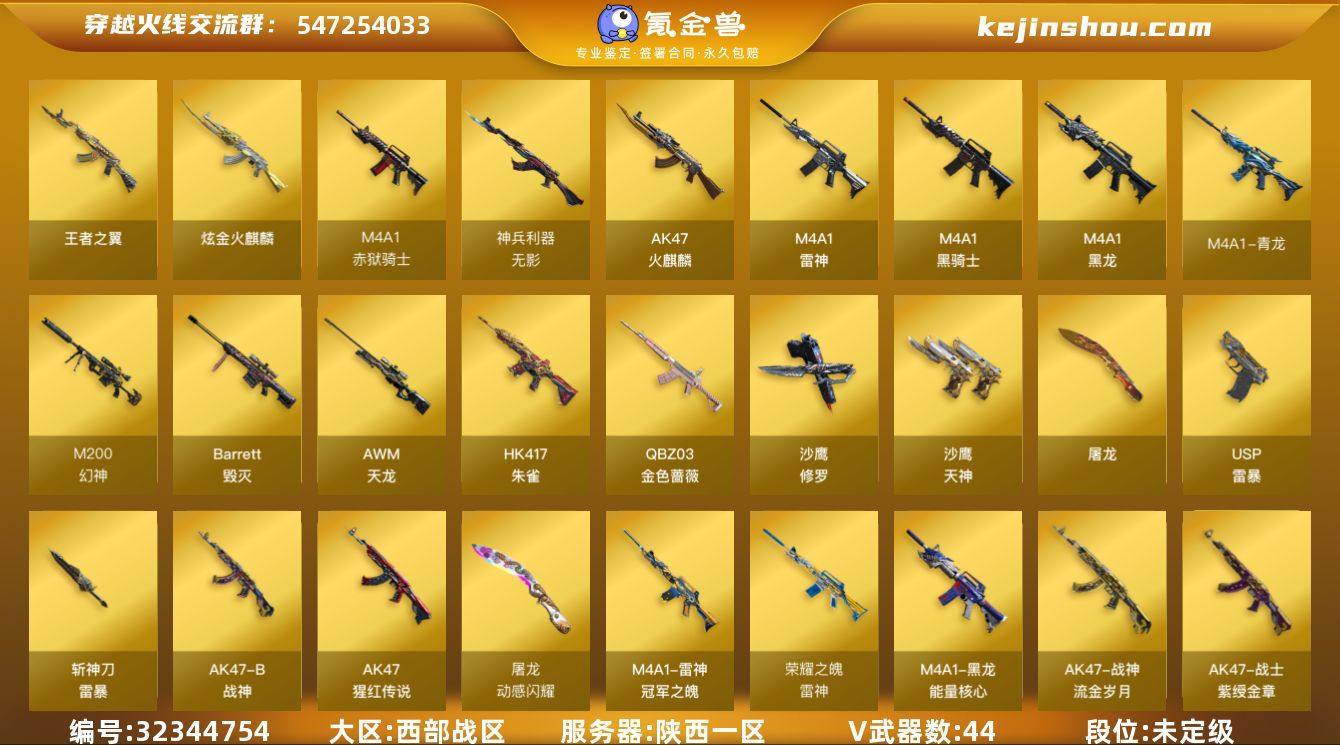 陕西一区-45V-1王者武器数-2炫金武器数 【热门武器】:QBZ03-金色蔷薇,HK417-朱雀,M4A1-青龙,M200-幻神,M4A1-黑骑士,加特林-炼狱,斯泰尔-蝴蝶,USP-雷暴,沙鹰-修罗*2 【王者炫金武器】:王者之翼,炫金火麒麟,炫金骑士 【音效卡】:M4A1-黑龙音效卡,M4A1-黑骑士音效卡,Barrett-毁灭音效卡 【皮肤】:雷神-荣耀之魄,雷神-冠军之魄,火麒麟-冠军之心,火麒麟-心动糖果,毁灭耀金皮肤,毁灭-黑大圣皮肤,黑龙-能量核心,战神-紫绶金章皮肤*5,战神-流金岁月皮肤*2,天龙-能量核心,AWM-天龙-传奇70KG,AWM-天龙-传奇白鲨,修罗-能量核心 【角色】:零,王者-瞳-闭月羞花,王者玲珑-小乔,乔伊教练,暗夜-X,虎妞,嘉年华灵狐,灵狐者-黄金海岸,龙儿,麻雀,曼陀罗-X,潘多拉-X,潘多拉-甜心教官,潜龙队-X,青霞仙子,斯沃特-X,铁骑荣耀,维纳斯,新娜塔莎,智影 【人偶武器】:斯泰尔-蝴蝶,AWM-灵狐-15周年嘉年华,闪光弹-小乔*2 【暴走生化】:黑龙吞噬者 【英雄级武器】:AK47-火麒麟*2,M4A1-黑龙,M4A1-雷神*2,M4A1-黑骑士,M4A1-青龙,HK417-朱雀,无影-神兵利器,QBZ03-金色蔷薇,AK-47-猩红传说*6,AK47-B-战神,AWM-天龙,Barrett-毁灭*2,M200-幻神,加...
