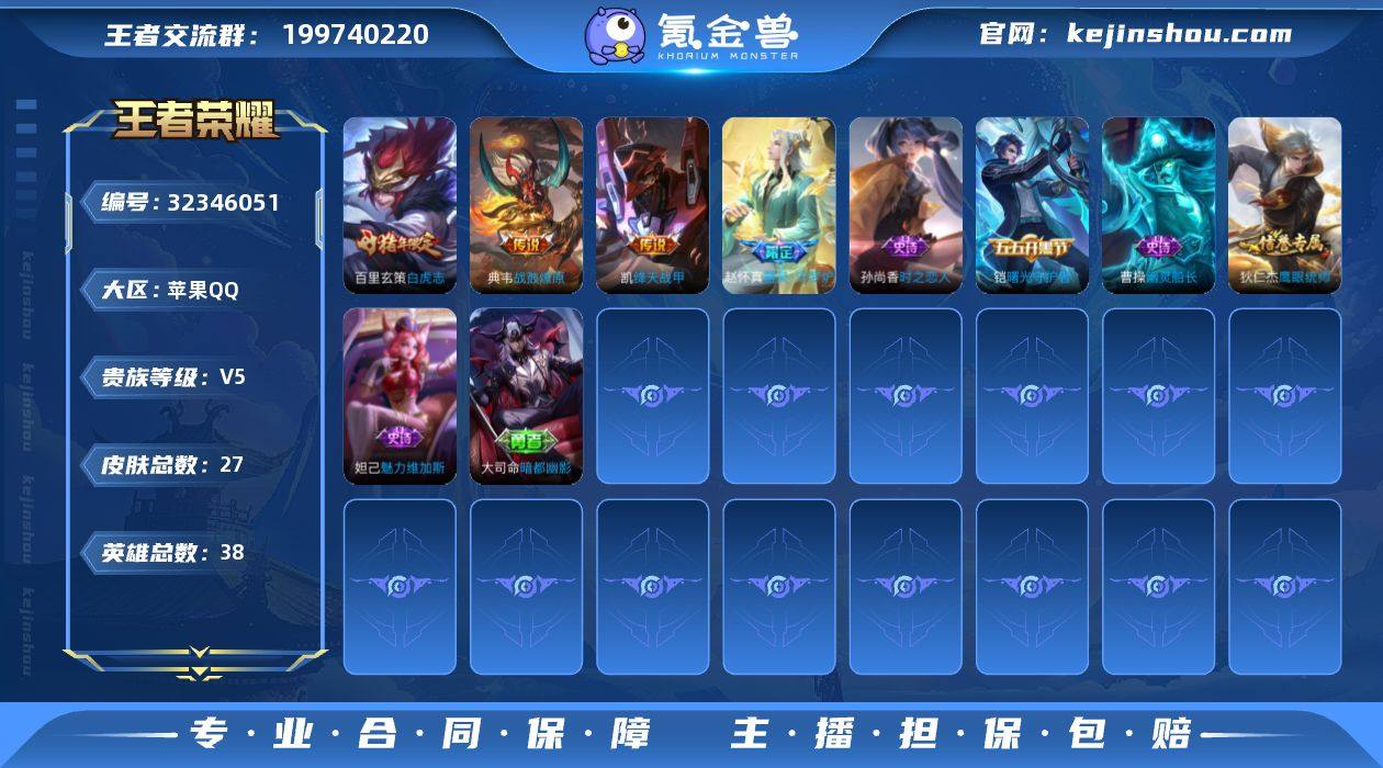 苹果Q-V5-最强王者段位-125英雄-124皮肤-5传说-36史诗【英雄全皮】:蒙恬全皮,影全皮【传说皮肤】:桑启鸣野蒿,澜逐花归海,马超无双飞将,镜炽阳神光,宫本武藏地狱之眼【限定皮肤】:姜子牙天穹之誓,狄仁杰阴阳师,赵云皇家上将,嬴政优雅恋人,元歌无心,狄仁杰魔术师,项羽海滩派对,关羽百相守梦,孙悟空至尊宝,裴擒虎李小龙,蒙恬荣光圣徽,沈梦溪龙舞盛年【赛季限定】:姜子牙天穹之誓,东皇太一噬灭天穹,太乙真人谧流熔炉,钟馗虚灵犬护,甄姬逆浪荇歌,亚瑟荣光之誓,蒙恬荣光圣徽,牛魔星界战将,项羽九幽镇关【战令限定】:孙悟空神迹守卫,周瑜百相守梦,孙策百相守梦,莱西奥光弋星穹,明世隐往忆晖光,周瑜线条小狗,小乔线条小狗【史诗皮肤】:周瑜线条小狗,小乔线条小狗,项羽九幽镇关,莱西奥光弋星穹,公孙离涂山容容,黄忠百相守梦,周瑜百相守梦,扁鹊灵蛊蚀心,狂铁龙之律动,牛魔星界战将,马可波罗星界特工,蒙恬荣光圣徽,关羽百相守梦,元歌无心,裴擒虎李小龙,橘右京修罗,不知火舞魅语,狄仁杰鹰眼统帅,阿轲节奏热浪,百里守约特工魅影,雅典娜冰冠公主,小乔缤纷独角兽,花木兰水晶猎龙者,孙悟空至尊宝,李白千年之狐,曹操幽灵船长,吕...