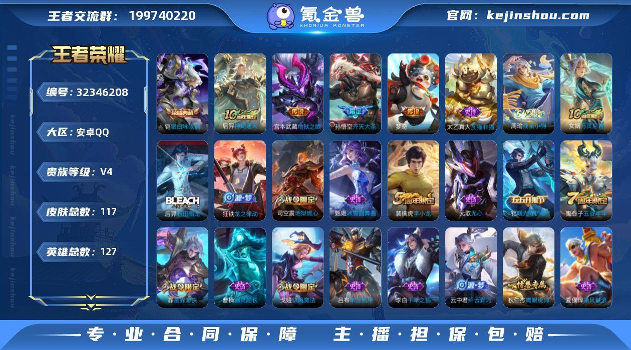 【WZF471】贵族4/皮肤117/典藏1/传说4/史诗33/英雄127/孙权全皮/敖隐全皮/银白咏叹调/神树通天/齐天大圣/胖达荣荣/地狱之眼/阴阳师/皇家上将/白昼王子/蔷薇恋人/无心/魔术师/海滩派对/云中旅人(s29)/五谷丰年/大漠名商(s28)/李小龙/擒涛扼浪(s31)/纤云弄巧/暖冬·兔眠/玲珑珍味/探海日志(s32)/海盐诗旅(s30)/星界游侠/驭风魔法/流音漫舞/地狱燃心/江河有灵/古海寻踪(s33)/蒙恬荣光圣徽/高渐离燃音魔法/妲己灵卜魔法/鬼谷子天穹祈灯(S34)/龙武盛年/剑破天穹(s35)/谧流熔炉/虚灵犬护/线条小狗-周瑜/太乙真人瓦猫非猫/万灵启世/石田雨龙/龙之律动/鹰眼统帅/星夜王子/逐浪之夏/曙光守护者/乘风破浪/乱世虎臣/末日机甲-吕布/千年之狐/幽灵船长/金属风暴/水果甜心/鬼剑武藏/偶像歌手/冰雪圆舞曲/圣诞恋歌/线条小狗-桑启/溯影追猎/极光幻客/逐霄之志/鹤鸣心笺/径山谋武/死霸装/雪境奇遇-西施/春野之旅/漠中幻影/完美运算/破局者/聚星闪耀/妄想特派/零食大作战/劲辣红锅/潮玩探月行/幻泉雾影-海月/潮玩造梦师/蔚蓝守将/乓乓大师/缤纷绘卷/秘密基地/特工战影/次元突破/炽热元素使/鲨炮海盗猫/丁香结/功夫老勺/幻想奇妙夜/海滩丽影/龙腾万里/汉昭烈帝/阿尔法小队/五福同心/拳王/死亡骑士/...