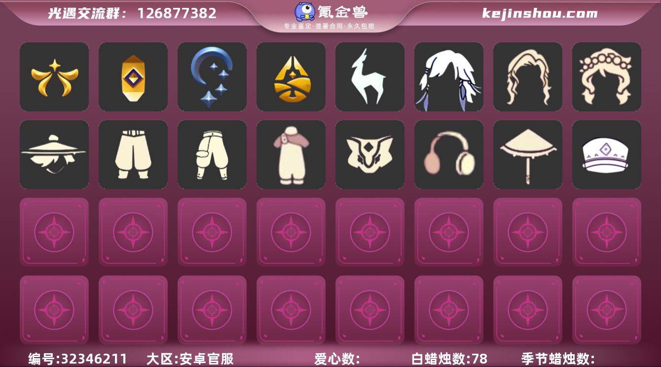 蜡烛数:78/爱心数:78/雨林/霞谷/欧若拉季/追忆季/夜行季/归巢季/九色鹿季/高领舞服/透明蝶翼斗/肩带/追忆之书/棕熊面具/绒毛斗篷/五塑彩羽发/五塑彩带斗/九色鹿丸子头/九色鹿丝带裤/九色鹿飞天斗篷/武士裤/背带裤/搓澡巾/虚荣/花环/红耳机/若笠/平顶帽/白金斗篷/黑金斗篷/红金斗篷/雨伞/黄鼠狼/猫猫头/归巢毕业发型/花环长发