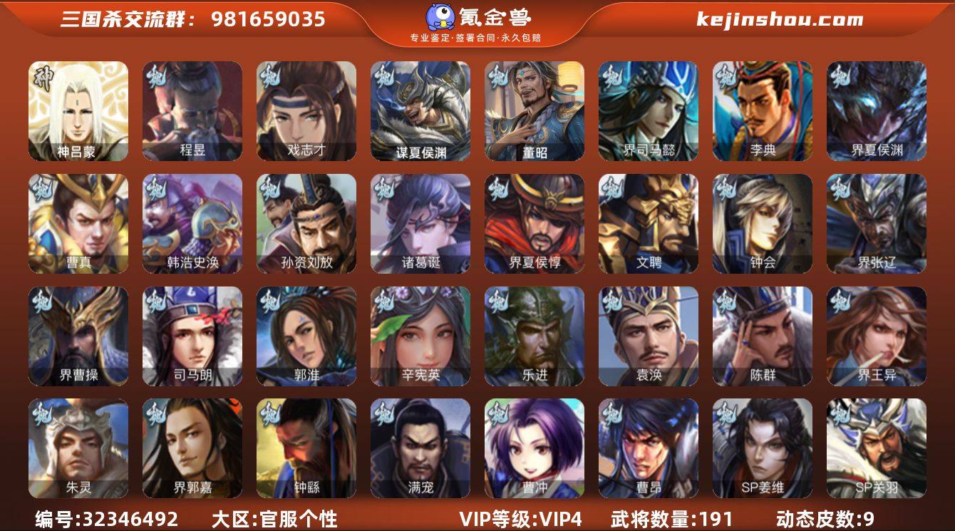 【14789577】官阶:中军将军;VIP等级:VIP4;史诗武将数量:6;动态皮肤数量:9;武将总数:191;史诗宝珠数量:7;将魂数量:477;神将:0;魏国史诗武将:4;蜀国史诗武将:1;吴国史诗武将:2;群史诗武将:1