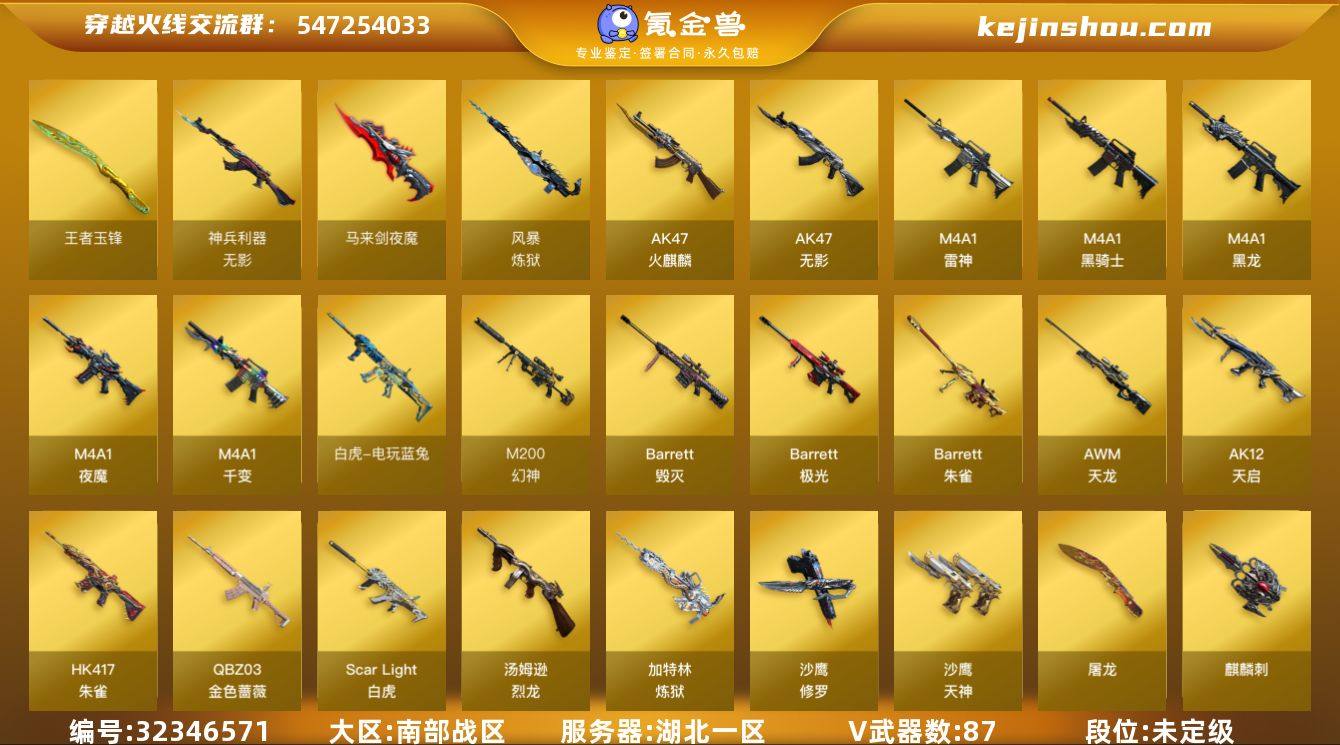 湖北一区-93V-7王者武器数-0炫金武器数 【热门武器】:QBZ03-金色蔷薇,M14EBR-玄武,Scar Light-白虎,HK417-朱雀,M200-幻神,M200-竞技荣光,死亡之眼,荣耀世冠-火麒麟,荣耀世冠-雷神,白虎-电玩蓝兔,柯尔特-冠军之特*2,荣耀世冠-柯尔特,毒蜂,M4A1-黑骑士,汤姆逊-烈龙*6,加特林-炼狱,毁灭-孙三炮,裁决-雪莉杨,火麒麟-绝迹,USP-雷暴,沙鹰-修罗,Knife-冠军之刃,炽芒蝶刃,荣耀世冠-龙啸 【王者炫金武器】:王者青龙,王者玉锋 【音效卡】:M200-幻神音效卡,AK47-火麒麟音效卡,M4A1-雷神音效卡,M4A1-黑骑士音效卡,Barrett-毁灭音效卡,QBZ03-金色蔷薇音效卡,Scar Light-白虎音效卡 【皮肤】:幻神-宠儿-2021MVP,幻神-巅峰荣耀,M200-幻神-N9-2022MVP,白虎-AG-CFPLS20冠军,QBZ03-冠军之薇,QBZ03-AG-CFPLS19冠军,雷神-荣耀之魄,雷神-虎将,雷神-耀金皮肤,雷神-冠军之魄,雷神-传奇N9,雷神-宠儿-2019MVP,雷神-荣耀世冠AG,雷神-机甲刑天皮肤,火麒麟-轻羽皮肤,火麒麟-战神关羽,火麒麟-荣耀世冠AG,火麒麟-心动糖果,毁灭-荣耀之怒,毁灭-冠军之怒,毁灭-BEAN-2020MVP,毁灭-黑大圣皮肤,毁灭-风暴*2,M4A1-千变-孔明皮肤,黑龙-冠军之武,黑骑士-...