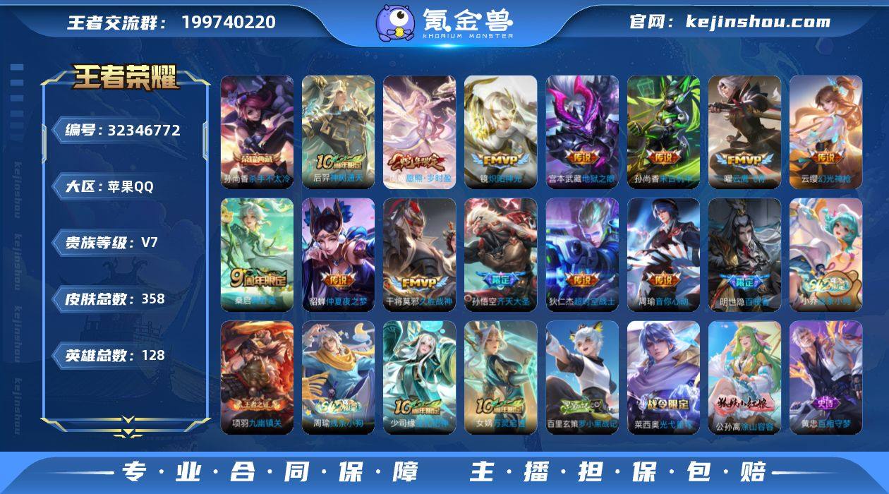 实名: 可修改 性别: 男号 贵族等级: V7 英雄数: 128 皮肤数: 358 荣耀水晶: 杀手不太冷 传说皮: 云鹰飞将,久胜战神,炽阳神光,末日机甲-孙尚香,仲夏夜之梦,地狱之眼,音你心动-周瑜,超时空战士-狄仁杰,幻光神枪,神树通天 限定皮: 梁祝,至尊宝,大圣娶亲,高山流水,傲雪梅枪,五谷丰年,山海·玄木吟,齐天大圣,鸣野蒿,逐霄战戟,愿照·岁时盈 亮点: 【优质装备】:杀手不太冷,云鹰飞将(小将军),久胜战神,炽阳神光,末日机甲-孙尚香(绿蚂蚱),仲夏夜之梦(大飞蛾),地狱之眼,音你心动-周瑜,超时空战士-狄仁杰,涂山容容
