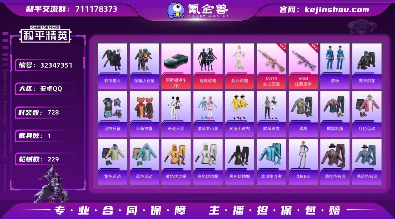 实名: 可修改 时装数: 728 载具数: 1 枪械数: 229 战备数: 1 热门装扮: 呆萌铁蟹,深海小丑鱼,迅捷狂鲨,鹰眼刺客,都市猎人,暗夜玫瑰,潮萌小黄鸭,激萌罗小黑,奇迹天团,软萌银虎,烟云彩露 载具: 阿斯顿·马丁DBS(绿) 稀有枪皮: AKM炫紫旋律,M416心之恋语 亮点: 【优质装备】:暗影哥特(红眼罩),都市猎人,七级M416-心之恋语,七级AKM-炫紫旋律