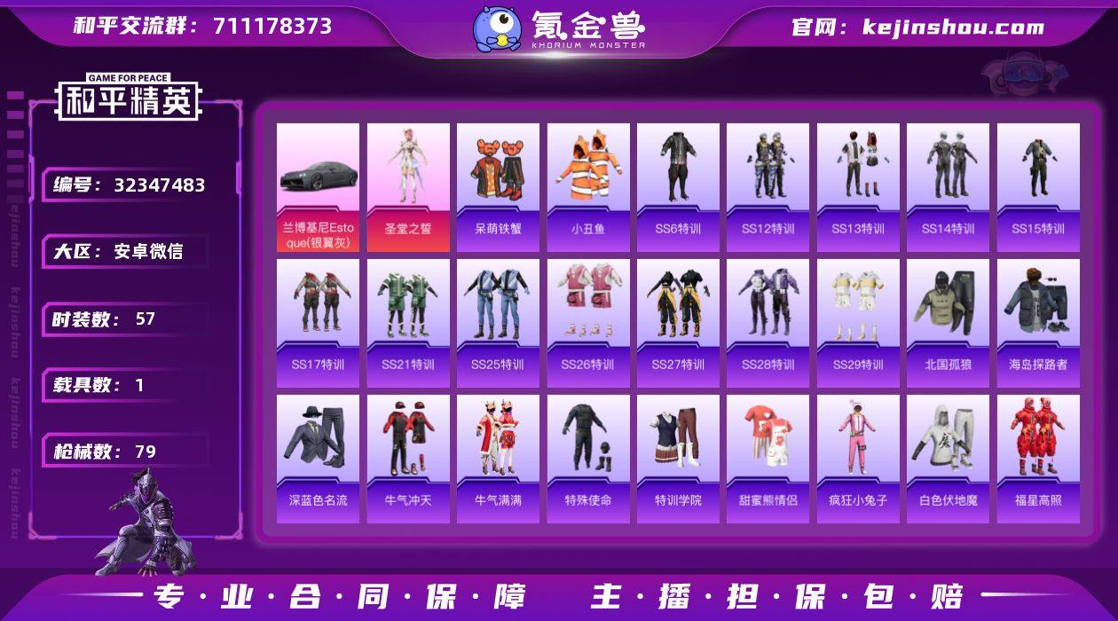 【mhp1189】安卓 微信-1粉装-1特效枪-1载具-1粉色飞行器-23349热力值-5王牌印记-57套装-79枪皮 【热门品类】:套装-小丑鱼 【粉色套装】:角色-圣堂之誓 【粉色枪皮等级】:Mk14-福马献瑞(五级) 【粉色载具】:兰博基尼Estoque(银翼灰) 【粉色枪皮】:Mk14-福马献瑞 【粉色飞行器】:炫彩糖果飞行器 【粉色降落伞】:炫彩糖果降落伞 【稀有套装】:套装-雪国风尚,套装-炫彩糖果,套装-马上有钱 【稀有枪皮】:AUG-冰晶雪宝,AKM-夜灯,AKM-破晓战魂,AKM-缤纷海域,M16A4-幻世战舞者,M16A4-蓝色火焰,SCAR-L-红色方程式,M416-红色方程式,M416-蓝色火焰,GROZA-暮色玫影,AUG-天降萌叽,AUG-耀粉歌者,QBZ-彩虹符号,QBZ-未来歌姬,M762-天降萌叽,M762-牛气冲天,蜜獾-天降萌叽,UZI-天降萌叽,UZI-炫彩节奏,UZI-红色方程式,UMP45-生命誓言,UMP45-蓝色火焰,Vector-夜灯,Vector-彩虹符号,Vector-生命誓言,Vector-创世·救赎,汤姆逊-天降萌叽,汤姆逊-奇异狩猎者,汤姆逊-耀粉歌者,Mini14-炫彩节奏,Mini14-穿刺龙虾,Mini14-银河战甲,M417-惊鸿侠骨,M200-惊鸿侠骨,S686-红色方程式,S12K-玩趣呆呆,S12K-破晓战魂,MG3-幻世战舞者,MG3-惊鸿侠骨,TMP-9-未来...