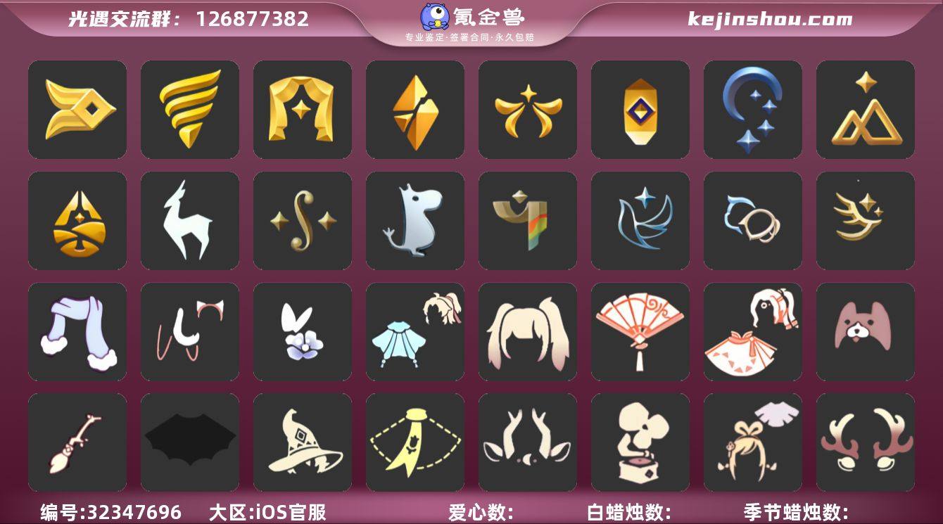 账号类型: 手机账号 季节已毕业: 风行季,潜海季,表演季,破晓季,欧若拉季,夜行季,追忆季,拾光季,归巢季,九色鹿季,二重奏季,姆明季,彩染季,青鸟季,双星季,迁徙季 完成地图: 雨林,霞谷,暮土 珍稀物品: 白枭,透明蝶翼斗 礼包: 蝙蝠套,巫师,围巾,九色鹿角,音乐桌,绊爱,鹿角,牛仔裤,兔子鞋,大耳狗发饰,运动鞋,秋千,茶桌,茶壶,白绒金,瑞雪,女巫裙,福娃,小船,人声乐器,奔跑发型,雪花球,橘子,红伞,兔子,南瓜,枯角,雪花,星月头饰,彩虹耳钉,蝴蝶结,魔法棒,奥利奥,四叶草,暗彩装扮,爱心眼镜,雪人鞋,新年耳钉,创始人,飞鸟纸伞,满月耳坠,线框斗,恶作剧飞行扫帚,衔福献瑞礼包,献瑞折扇礼包,渐变双马尾发型礼包,小狗周年发饰,青衫落拓礼包,蝴蝶与花发饰礼包,皮皮猫套装礼包,冬日围巾斗篷 裤子: 武士裤,背带裤,白棉裤,搓澡巾 面具: 黄鼠狼,红狐狸 面饰: 红耳机,黑框眼镜 项链: 围巾 发型: 正太,樱花,公主头,虚荣,猫耳,白枭 头饰: 花环 斗篷: 白金,红金,花瓣斗篷 配饰: 雨伞,高音钢琴,笛子
