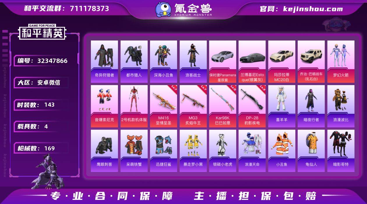 【932797】身法素材号!红螳螂!7级至情至圣!都市猎人!暗影哥特!深海小丑鱼!安卓 微信-3粉装-4特效枪-4载具-4粉色飞行器-57666热力值-8王牌印记-143套装-169枪皮 【热门品类】:粉装-梦幻火箭,粉装-音爆索尼克,套装-浪漫天命,套装-都市猎人,套装-深海小丑鱼,套装-小丑鱼,套装-奇异狩猎者,套装-暗夜行者,套装-浪客战士,套装-龟仙人,套装-暗影哥特,套装-浪漫波比,套装-粉红小猪 【粉色套装】:粉装-梦幻火箭,角色-2号机款机体服,粉装-音爆索尼克 【粉色枪皮等级】:M416-至情至圣(七级),Kar98K-巳巳如意(五级),DP-28-豹影疾电(三级),MG3-炙焰牛王(七级) 【粉色载具】:兰博基尼Estoque(银翼灰),玛莎拉蒂MC20(星石白),乔治巴顿战车(乳石白),保时捷Panamera(星辰紫) 【粉色枪皮】:M416-至情至圣,Kar98K-巳巳如意,DP-28-豹影疾电,MG3-炙焰牛王 【粉色飞行器】:梦幻火箭飞行器,闪光银龙飞行器,暖熊萌萌飞行器 【粉色降落伞】:幻影战神降落伞,粉色回忆降落伞,梦幻火箭降落伞,星之彼岸降落伞,暗星紫秘降落伞,青春物语降落伞,橘柚倾心降落伞,筑梦精灵降落伞,环太平洋降落伞,翩跹演武降落伞,旋转彩虹降落伞,宇宙意志降落伞,喜羊羊...
