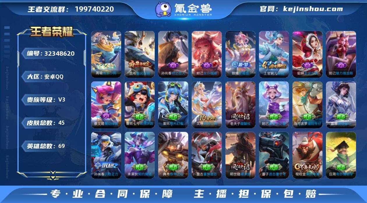 安卓Q-V3-永恒钻石III段位-69英雄-45皮肤-8史诗 【限定皮肤】:狄仁杰阴阳师,吕布御风骁将,狄仁杰万华元夜,老夫子醍醐杖,程咬金演武夺筹,兰陵王金庭之子,钟馗驱傩正仪,鬼谷子原初探秘者,苏烈千军破阵,沈梦溪大漠名商,明世隐疑决卦,上官婉儿梁祝,嫦娥拒霜思 【年限皮肤】:吕布御风骁将 【赛季限定】:明世隐疑决卦,老夫子醍醐杖,鬼谷子原初探秘者,狄仁杰万华元夜,程咬金演武夺筹,钟馗驱傩正仪,苏烈千军破阵,兰陵王金庭之子,沈梦溪大漠名商 【战令限定】:周瑜线条小狗 【史诗皮肤】:周瑜线条小狗,嫦娥拒霜思,吕布御风骁将,孙尚香时之恋人,上官婉儿梁祝,蔡文姬舞动绿茵,妲己女仆咖啡,妲己魅力维加斯,貂蝉圣诞恋歌 【其他皮肤】:鲁班七号班班快跑,蚩奼极光幻客,艾琳鹤鸣心笺,刘备潮玩造梦师,蒙犽胡桃狂想曲,沈梦溪大漠名商,米莱狄契约魔法,兰陵王金庭之子,马可波罗潮玩牛仔,妲己紫罗兰之誓,典韦铁甲之心,苏烈千军破阵,钟馗驱傩正仪,盘古重装意志,张良缤纷绘卷,程咬金演武夺筹,露娜瓷语鉴心,狄仁杰万华元夜,鬼谷子原初探秘者,老夫子醍醐杖,明世隐疑决卦,庄周奇妙博物学,孙尚香沉稳之力,墨子进击墨子号,狄仁杰阴阳师,花木...