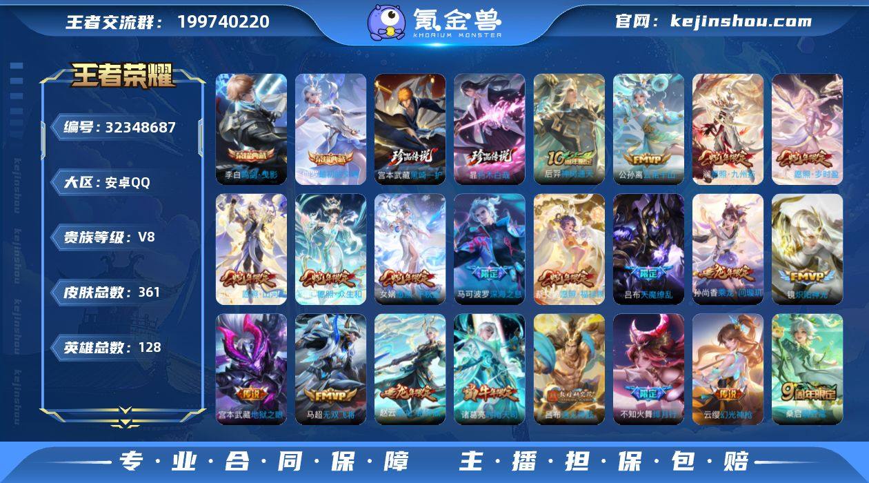 V9 4典藏 1无双 1珍品 22传说 3星元 361皮肤 125英雄 【4水晶】李白-鸣剑·曳影,小乔-天鹅之梦,韩信-弑枪猎影【1无双】甄姬-雪境奇遇【1珍品传说】马可波罗-怪盗基德【22传说】李信-山海·炽霜斩,李白-诗剑行,不知火舞-绯月行,孙尚香-音你闪耀,马可波罗-深海之息,马超-无双飞将,貂蝉-仲夏夜之梦,貂蝉-猫影幻舞,宫本武藏-地狱之眼,花木兰-冠军飞将,镜-炽阳神光,梦奇-胖达荣荣,王昭君-乞巧织情,虞姬-启明星使,诸葛亮-时雨天司,大乔-时之奇旅,曜-云鹰飞将,王昭君-映山客,桑启-鸣野蒿,云缨-幻光神枪,妲己-愿照·众生和,女娲-愿照·千秋盛【3星元】武则天-幻海之心,宫本武藏-幽冥之眼,貂蝉-金色仲夏夜之梦【93史诗】元歌-无心,上官婉儿-神器·万象笔,鬼谷子-五谷丰年,弈星-滕王阁序,赵云-未来纪元,钟无艳-超时空战士,金蝉-唐三藏,狂铁-电玩高手,阿轲-暗夜猫娘,阿轲-节奏热浪,安琪拉-魔法小厨娘,安琪拉-心灵骇客,白起-星夜王子,百里守约-特工魅影,百里玄策-原初追逐者,不知火舞-魅语,蔡文姬-舞动绿茵,曹操-幽灵船长,蔡文姬-繁星吟游,嫦娥-拒霜思,程咬金-功夫厨神,妲己-女仆咖啡,妲己-魅力维加斯,大乔-猫狗日记,狄仁杰-魔术师,狄仁杰-鹰眼统帅,貂蝉-圣诞恋歌,伽罗-箭羽风息,伽罗-天狼溯光者,干将莫邪-真爱魔法,公孙离-蜜橘之夏,宫本武藏-鬼剑武藏,关羽-冰锋战神,韩信-傲雪梅枪,花木兰-水晶猎龙者,花木兰-默契交锋,橘右京-修罗,黄忠-火炮绅士,镜-匿光追影者,铠-曙光守护者,李白-千年之狐,李元芳-逐浪之夏,廉颇-地狱岩魂,刘邦-德古拉伯爵,刘禅-绅士熊喵,露娜-紫霞仙子,鲁班七号-电玩小子,吕布-圣诞狂欢,吕布-末日机甲,马可波罗-暗影游猎,米莱狄-胡桃异想国,墨子-金属风暴,娜可露露-晚萤,裴擒虎-李小龙,上官婉儿-天狼绘梦者,沈梦溪-月团寄思,司马懿-暗渊魔法,孙策-猫狗日记,孙尚香-水果甜心,孙尚香-时之恋人,孙悟空-至尊宝,孙悟空...