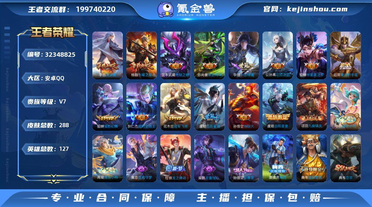 【特价出售/店主推荐】金标诸葛亮、9市标、打野37段、中路37段、对抗路33段 安卓Q-V6-荣耀黄金I段位-127英雄-268皮肤-1典藏皮肤-7传说-65史诗 【英雄全皮】:影全皮 【荣耀典藏】:铠银白咏叹调 【传说皮肤】:后羿神树通天,桑启鸣野蒿,镜炽阳神光,貂蝉猫影幻舞,花木兰冠军飞将,诸葛亮武陵仙君,李白凤求凰 【限定皮肤】:白起狰,狄仁杰阴阳师,虞姬凯尔特女王,赵云皇家上将,嬴政优雅恋人,孙尚香蔷薇恋人,庄周蜃楼王,庄周高山流水,孙膑妖精王,芈月重明,芈月幻夜卜梦,元歌无心,夏侯惇朔风刀,甄姬游园惊梦,曹操烛龙,曹操天狼征服者,典韦穷奇,狄仁杰魔术师,狄仁杰万华元夜,达摩沙漠行僧,项羽海滩派对,老夫子醍醐杖,关羽冰锋战神,安琪拉魔法小厨娘,程咬金演武夺筹,兰陵王金庭之子,孙悟空孙行者,牛魔御旌,后羿圣弓游侠,李元芳云中旅人,钟馗驱傩正仪,杨玉环遇见飞天,干将莫邪真爱魔法,雅典娜黎明之约,蔡文姬繁星吟游,太乙真人饕餮,鬼谷子原初探秘者,鬼谷子五谷丰年,诸葛亮武陵仙君,黄忠火炮绅士,苏烈千军破阵,百里玄策原初追逐者,弈星混沌棋,梦奇顽趣,梦奇天降福星,公孙离玉兔公主,沈梦溪大漠名商,明世隐疑决卦,裴擒虎李小龙,裴擒虎擒涛扼浪,狂铁御狮,米莱狄御霄,云中君纤云弄巧,盾山御銮,上官婉儿梁祝,嫦娥拒霜思,鲁班大师探海日志,桑启海盐诗旅,阿古朵江河有灵,张良古海寻踪,蒙犽百解令,蒙恬荣光圣徽,鬼谷子天穹祈灯 【年限皮肤】:李白凤求凰 【赛季限定】:庄周蜃楼王,孙膑妖精王,虞姬凯尔特女王,白起狰,太乙真人饕餮,曹操烛龙,芈月重明,典韦穷奇,狂铁御狮,米莱狄御霄,牛魔御旌,盾山御銮,夏侯惇朔风刀,弈星混沌棋,明世隐疑决卦,老夫子醍醐杖,鬼谷子原初探秘者,狄仁杰万华元夜,程咬金演武夺筹,钟馗驱傩正仪,苏烈千军破阵,达...