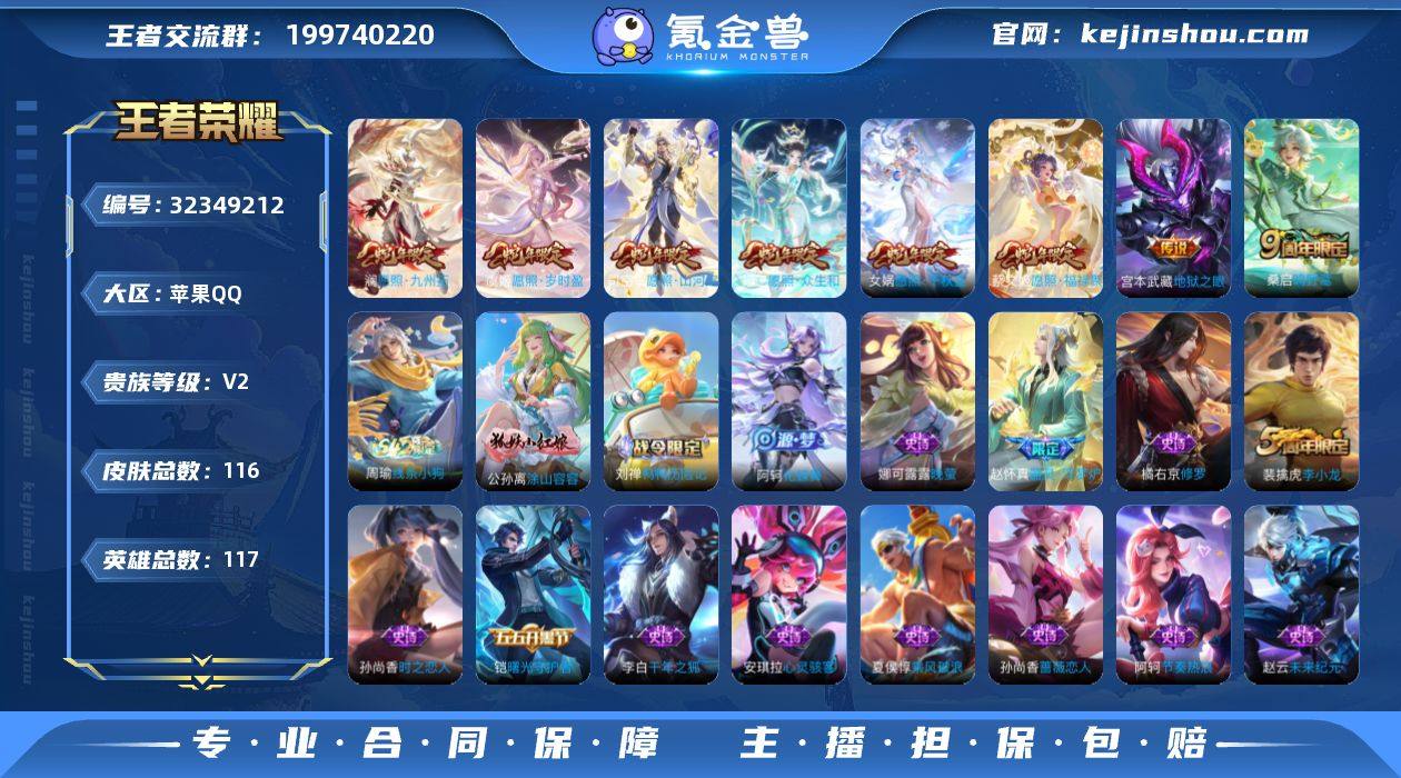 无二次-苹果Q-V6-至尊星耀III段位-117英雄-116皮肤-8传说-30史诗HZ2631402 【英雄全皮】:孙权全皮 【传说皮肤】:司空震愿照山河定,女娲愿照千秋盛,妲己愿照众生和,澜愿照九州拓,蔡文姬愿照福禄聚,虞姬愿照岁时盈,桑启鸣野蒿,宫本武藏地狱之眼 【限定皮肤】:姜子牙天穹之誓,狄仁杰阴阳师,赵云皇家上将,孙尚香蔷薇恋人,狄仁杰魔术师,达摩沙漠行僧,项羽海滩派对,兰陵王金庭之子,沈梦溪大漠名商,裴擒虎李小龙,裴擒虎擒涛扼浪,桑启海盐诗旅,沈梦溪龙舞盛年,刘邦剑破天穹 【年限皮肤】:司空震愿照山河定,女娲愿照千秋盛,妲己愿照众生和,澜愿照九州拓,蔡文姬愿照福禄聚,虞姬愿照岁时盈 【赛季限定】:达摩沙漠行僧,兰陵王金庭之子,沈梦溪大漠名商,桑启海盐诗旅,裴擒虎擒涛扼浪,刘邦剑破天穹,姜子牙天穹之誓,东皇太一噬灭天穹,太乙真人谧流熔炉,甄姬逆浪荇歌,亚瑟荣光之誓 【战令限定】:刘禅鸭鸭历险记,沈梦溪鸭鸭历险记,周瑜线条小狗 【史诗皮肤】:周瑜线条小狗,公孙离涂山容容,刘禅鸭鸭历险记,阿轲化蝶舞,赵怀真器灵浮梦炉,米莱狄完美假期,裴擒虎李小龙,孙尚香时之恋人,橘右京修罗,娜可露露晚萤,伽罗箭羽风息,孙策猫狗日记,...
