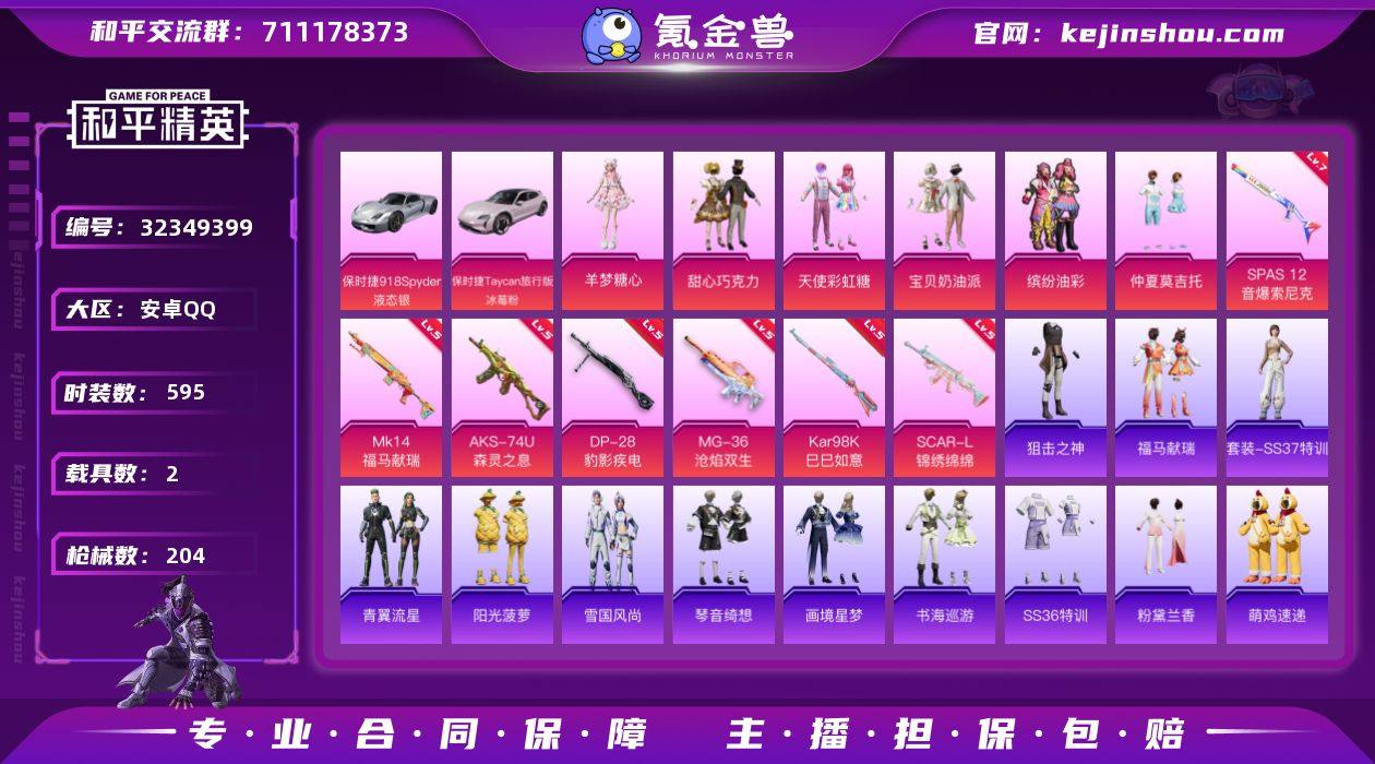 漂亮公主衣柜号/62级收藏家【巧克力三姐妹/小番茄/猪妹】美雪/羊梦糖心/暗影哥特/地铁满天赋/保时捷/保时捷918 实名: 可修改 时装数: 595 载具数: 2 枪械数: 204 战备数: 158 热门装扮: 甜心巧克力,呆萌铁蟹,宝贝奶油派,天使彩虹糖,缤纷油彩,仲夏莫吉托,羊梦糖心 载具: 保时捷918Spyder(液态银),保时捷Taycan旅行版(冰莓粉) 稀有枪皮: SPAS-12音爆索尼克,SCAR-L-锦绣绵绵,Kar98K-巳巳如意,DP-28-豹影疾电,MG-36-沧焰双生,AKS-74U-森灵之息