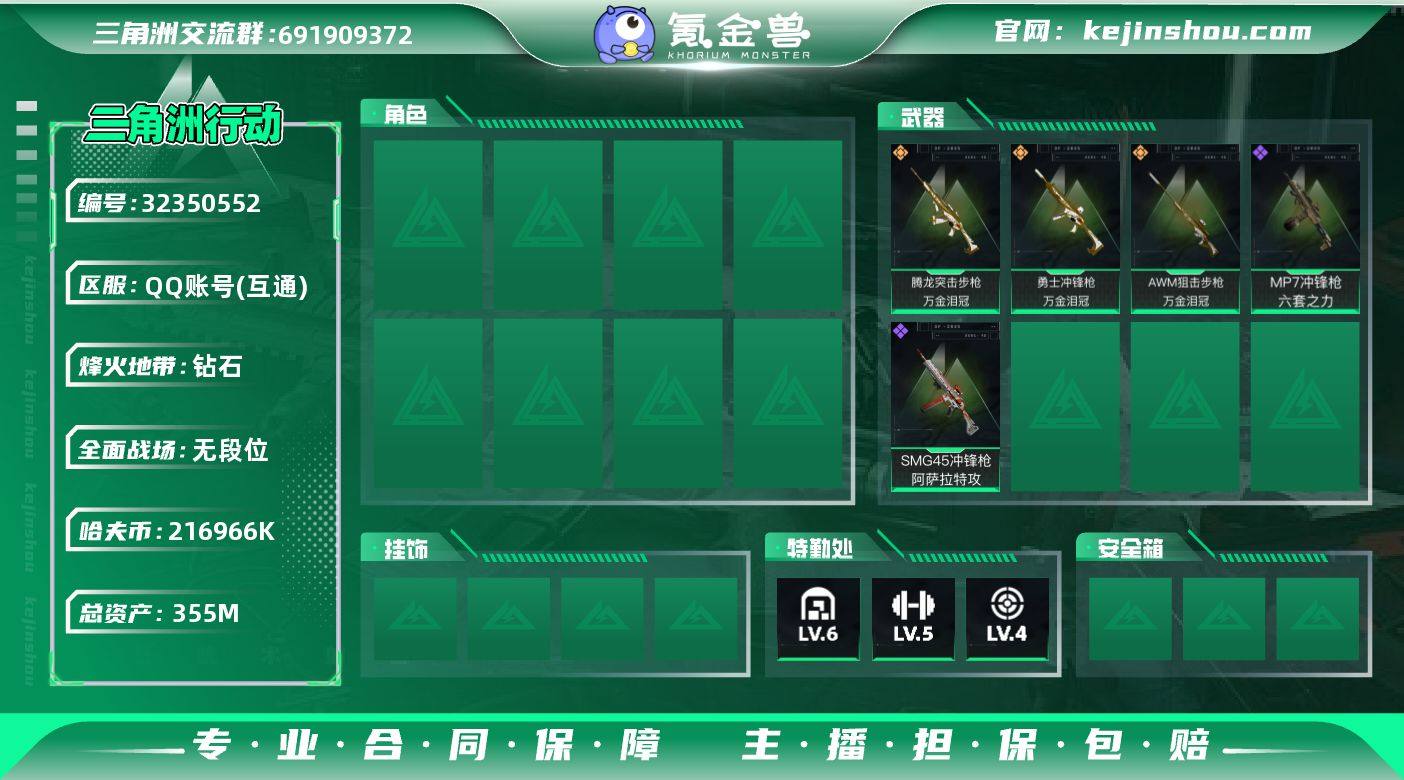 【精品性价比】C4335-98m总资产-1660k哈伏币-60烽火等级-钻石-41战场等级-尉官 【干员外观】:骇爪-维什戴尔,红狼-电锯惊魂,乌鲁鲁-荒原猎手 【近战皮肤】:近战-暗星,近战-处刑者3级,近战-黑鹰 【传说外观】:M4A1突击步枪-阿米娅,AKM突击步枪-锦绣,AUG突击步枪-悠然茶歇,SCAR-H战斗步枪-启航,腾龙突击步枪-马年祥瑞,K437突击步枪-锦绣,MK47突击步枪-悠然茶歇,MK47突击步枪-暗星,UZI冲锋枪-悠然茶歇,SMG-45冲锋枪-锦绣,SR-3M紧凑突击步枪-暗星,M14射手步枪-蛮荒,M14射手步枪-缄花,SR-25射手步枪-缄花,R93狙击步枪-维什戴尔,.357左轮-缄花,G18-马年祥瑞 【史诗外观】:QBZ95-1突击步枪-曙光,K416突击步枪-腊梅,SG552突击步枪-深海恐惧,SG552突击步枪-哈夫克警备,G3战斗步枪-哈夫克警备,腾龙突击步枪-猎鳄行动,K437突击步枪-丛影谍踪,MP5冲锋枪-战术竞备,MP5冲锋枪-竞技风,Vector冲锋枪-阿萨拉文明,SMG-45冲锋枪-阿萨拉特攻,SR-3M紧凑突击步枪-开工大吉,勇士冲锋枪-工业狂潮,勇士冲锋枪-丛影谍踪,MP7冲锋枪-六套之力,PKM通用机枪-阿萨拉特攻,M249轻机枪-丛影谍踪,QJB201轻机枪-炽焰,VSS射手步枪-丛影谍踪,M14射手步枪-工业狂潮, M14射手步枪-航天庆典,SV-98狙击步枪-囚徒,SV-98狙击步枪-猎鳄行动 【稀有外观】:M870霰弹枪-地平线,UZI冲锋枪-旧梦,AS Val突击步枪-休闲时光,AKM突击步枪-肃杀,QBZ95-1突击步枪-公平竞技,K416突击步枪-前沿科技,K416突击步枪-一帆风顺,M7战斗步枪-前沿科技,M7战斗步枪-捣蛋鬼,SG552突击步枪-马年新春,SG552突击步枪-贴花艺术, AK-12突击步枪-马年新春,SCAR-H战斗步枪-荣耀列队,CAR-15突击步枪-来财,K437突击步枪-生存指令,KC17突击步枪-来财,MK47突击步枪-精英联盟,MP5冲锋枪-弄臣,MP5冲锋枪-哈夫克卫队,P90冲锋枪-黄昏...