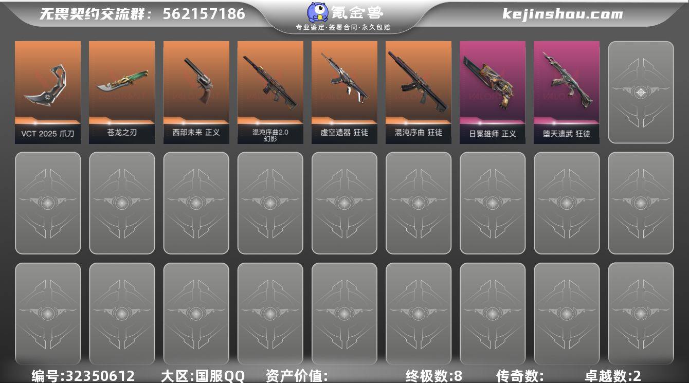 【QYZ1220】终极*8/卓越*2/皮肤*20/等级*208/段位:黄金/VCT 2025赛季礼包/幻棱/炼狱/维斯/暮蝶/钛狐/壹决/铁臂/捷风/雷兹/幽影/不死鸟/贤者/猎枭/蝰蛇/零/芮娜/奇乐/尚勃勒/霓虹/斯凯/夜露/星礈/K/O/海神/盖可/黑梦/钢锁/苍龙之刃/VCT 2025 爪刀/紫金爪刀/魄月玄刃/狂徒-混沌序曲/狂徒-虚空遗器/狂徒-堕天遗武/幻影-混沌序曲2.0/标配-超能偶像/正义-西部未来/正义-日冕雄师/正义-超限闪存/正义-纳米打击/鬼魅-流星兵团/鬼魅-诡秘蛇影/鬼魅-星云暗涌/终章:激斗汉堡 卡面/进入射程 卡面/分崩离析 卡面/《双城之战》拥抱 卡面/精灵大战 卡面/欢迎来到底城 卡面/南瓜盛典 卡面/修车达人 卡面/正义的化身 卡面/终章:生意人麦宝 卡面/铁之华 卡面/失而复得 卡面/时间到 卡面/最高舞台 卡面/归乡 // 蝰蛇 卡面/声感陷阱设计图 卡面/梦幻奶茶 卡面/趁热吃 卡面/源能反应 卡面/零点嗅探设计图 卡面/无畏契约GO!第一卷:芮娜 卡面/清除名单 卡面/无畏契约GO!第一卷:零 卡面/化茧成蝶 卡面/暗枪 卡面/钢锁vs盖可 卡面/天台狂欢 卡面/代号红色 卡面/新兵报到 卡面/V契约 卡面/无畏契约 卡面/嗨宝南瓜灯 喷漆/啊? 喷漆/嘭! 喷漆/都算到了 喷漆/控场勿近 喷漆/小丑猫 喷漆/熊抱 喷漆/...