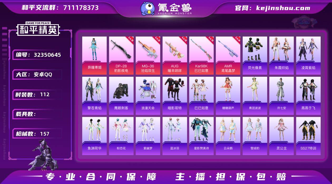 安卓 手Q-2粉装-9特效枪-0载具-1粉色飞行器-40431热力值-4王牌印记-112套装-157枪皮 【热门品类】:套装-浪漫天命,套装-暗影哥特 【粉色套装】:角色-异瞳寒姬,角色-虎痴许褚 【粉色枪皮等级】:AUG-暖羊咩咩(五级),AUG-罪夜之冕(六级),ACE32-萌骑漫游(二级),AKS-74U-森灵之息(五级),Kar98K-巳巳如意(五级),Mk14-福马献瑞(五级),AMR-鸢尾晶梦(四级),DP-28-豹影疾电(五级),MG-36-沧焰双生(五级) 【粉色枪皮】:AUG-暖羊咩咩,AUG-罪夜之冕,ACE32-萌骑漫游,AKS-74U-森灵之息,Kar98K-巳巳如意,Mk14-福马献瑞,AMR-鸢尾晶梦,DP-28-豹影疾电,MG-36-沧焰双生 【粉色飞行器】:炫彩糖果飞行器 【粉色降落伞】:荧海星豚降落伞,绯穹魔姬降落伞,极意拳锋降落伞,炫彩糖果降落伞,暮色玫影降落伞 【稀有套装】:套装-巳巳如意,套装-荧光像素,套装-雪国风尚,套装-炫彩糖果,角色-幸运青,套装-马上来财,套装-糖糖葫芦,套装-青团波波,角色-许七安,套装-燕燕于飞,套装-鱼渊荷华,套装-粉恋花,套装-紫幽梦,套装-蓝冰羽,套装-星影赞美诗,套装-云朵鹅,套装-雪绒豹,角色-灵公主,套装-朱霞炽焰,套装-凌霄紫焰,套装-擎苍青焰,套装-雨过天青,套装-红釉青花...