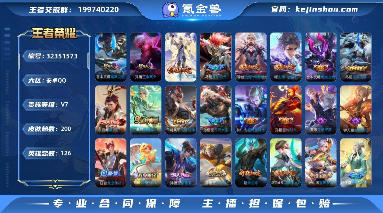 V7【战士号 200皮肤 13传说 贵族积分28444 荣耀印记 夺宝235抽】安卓QQ/V7/无双王者/200皮肤/126英雄/13传说/58史诗/7稀有英雄 【2 星传说皮肤】幽冥火 孙悟空,幽冥之眼 宫本武藏, 【13 传说皮肤】无双飞将 马超,地狱火 孙悟空,齐天大圣 孙悟空,神骥·逐星野 马超,地狱之眼 宫本武藏,曦玄引 吕布,久胜战神 干将莫邪,山海·炽霜斩 李信,超时空战士 狄仁杰,山海·苍雷引 曜,琥珀纪元 马超,愿照·山河定 司空震,鸣野蒿 桑启, 【58 史诗皮肤】末日机甲 吕布,紫霞仙子 露娜,暗渊魔法 司马懿,天秀·启明 杨戬,妄想食味 姬小满,德古拉伯爵 刘邦,山海·玄木吟 马可波罗,心灵战警 亚瑟,五谷丰年 鬼谷子,戍鼓铭心 钟无艳,鬼剑武藏 宫本武藏,百相守梦 黄忠,星夜王子 白起,线条小狗 周瑜,摇滚巨星 嬴政,修罗 橘右京,黄金分割率 诸葛亮,偶像歌手 王昭君,荣光圣徽 蒙恬,女仆咖啡 妲己,赏金猎手 澜,九幽镇关 项羽,星界游侠 暃,鹰眼统帅 狄仁杰,飞衡 韩信,孙行者 孙悟空,李小龙 裴擒虎,纤云弄巧 云中君,金属风暴 墨子,匿光侦查者 李元芳,特工魅影 百里守约,原初追逐者 百里玄策,未来纪元 赵云,黎明之约 雅典娜,鸭鸭历险记 刘禅,魔术师 狄仁杰,龙之律动 狂铁,皇家上将 赵云,至尊宝 孙悟空,功夫厨神 程...