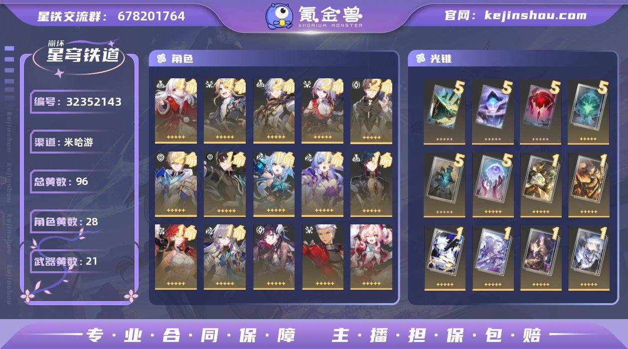 【崩坏·星穹铁道】冒险等级:70,女主,五星数量:49,五星角色:彦卿 * 4命,克拉拉 * 4命,杰帕德 * 2命,瓦尔特 * 2命,托帕&账账 * 2命,白厄 * 2命,布洛妮娅 * 1命,姬子 * 1命,刃 * 1命,丹恒·饮月 * 1命,知更鸟 * 1命,刻律德菈 * 1命,丹恒·腾荒 * 1命,白露,星期日,大黑塔,卡芙卡,遐蝶,符玄,镜流,藿藿,真理医生,黑天鹅,花火,风堇,砂金,Archer,海瑟音__五星光锥:星海巡航 * 5精,记忆的质料 * 5精,记一位星神的陨落 * 5精,不息的演算 * 5精,孤独的疗愈 * 5精,记忆永不落幕 * 5精,制胜的瞬间,银河铁道之夜,银河铁道之夜,银河铁道之夜,以世界之名,无可取代的东西,如泥酣眠,如泥酣眠,回到大地的飞行,向着不可追问处,让告别,更美一些,重塑时光之忆,黎明恰如此燃烧,理想燃烧的地狱,纵然山河万程__四星角色:娜塔莎 * 6命,虎克 * 6命,貊泽 * 6命,黑塔 * 6命,丹恒 * 6命,艾丝妲 * 6命,希露瓦 * 6命,停云 * 6命,素裳 * 6命,桑博 * 6命,三月七 * 6命,青雀 * 6命,佩拉 * 6命,驭空 * 6命,卢卡 * 6命,玲可 * 6命,桂乃芬 * 6命,寒鸦 * 6命,雪衣 * 6命,米沙 * 6命,加拉赫 * 6命,阿兰 * 3命21白厄队