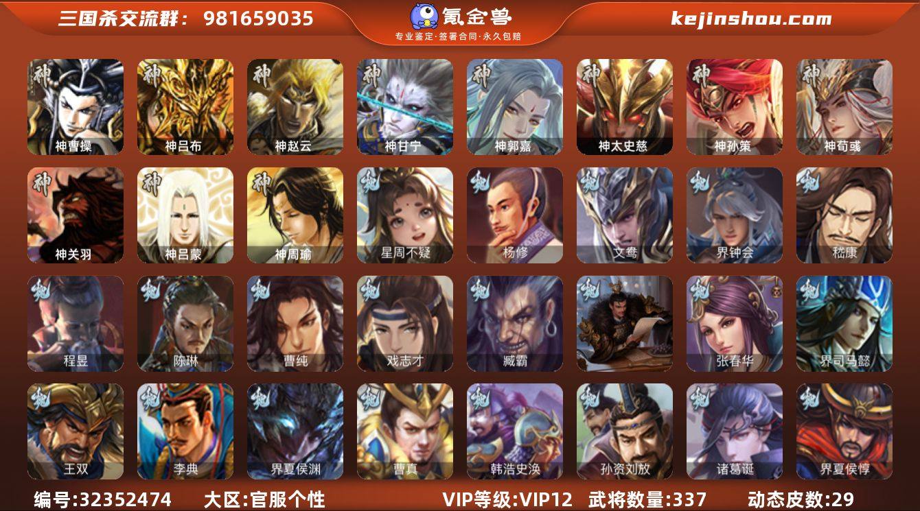 官阶:大将军;VIP等级:VIP12;史诗武将数量:50;动态皮肤数量:29;武将总数:337;史诗宝珠数量:61;将魂数量:13415;神将:8;魏国史诗武将:8;蜀国史诗武将:11;吴国史诗武将:9;群史诗武将:15 神曹操,神吕布,神赵云,神甘宁,神郭嘉,神太史慈,神孙策,神荀彧,星周不疑,杨修,界钟会,嵇康,陈琳,曹纯,戏志才,程昱,关索,马云騄,谋黄忠,谋赵云,诸葛瞻,周群,赵襄,张星彩,沙摩柯,傅佥,花鬘,谋黄盖,谋孙策,吴景,孙寒华,骆统,界徐盛,界步练师,文鸯,谋貂蝉,界沮授,左慈,杨彪,星黄忠,苏飞,麹义,刘焉,沮授,界李儒,杜预,卑弥呼,许攸,兀突骨,士燮,神吕蒙,神周瑜,神关羽,SP关羽,SP蔡文姬,乐进,曹昂,诸葛诞,朱灵,文聘,SP姜维,张春华,钟会,曹冲,郭淮,满宠,界王异,界曹操,界司马懿,界夏侯惇,界张辽,界许褚,界郭嘉,李典,曹真,韩浩史涣,陈群,曹叡,曹休,钟繇,司马朗,王基,郭皇后,孙资刘放,辛宪英,界甄姬,吕虔,鲁芝,界典韦,界荀彧,界邓艾,张恭,界满宠,卞夫人,华歆,袁涣,王双,崔琰,阮慧,谋徐晃,谋于禁,界曹休,牵招,界夏侯渊,臧霸,唐咨,SP孙尚香,关银屏,夏侯霸,马良,关兴张苞,廖化,界马岱,关平,简雍,刘封,界法正,界关兴张苞,界刘备,界关羽,界张飞,界赵云,界马超,SP徐庶,吴懿,周仓,张松,刘谌,夏侯氏,糜竺,...