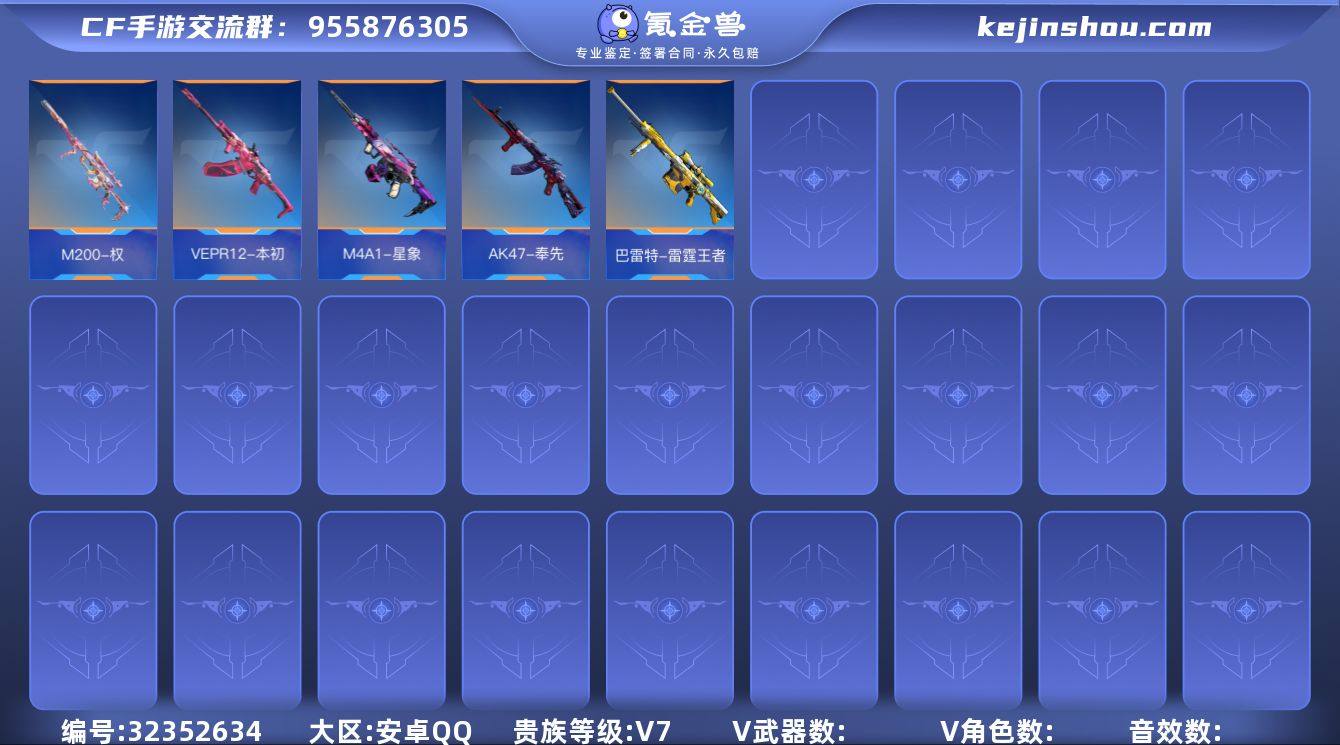 FC-B32F15 安卓QQ,成人号:是,角色等级:153,实名:有修改人脸机会/实名是本人,段位:枪圣SS,VIP等级:V8,V武器数量:367,V角色数量:12,V总数量:303,王者武器数:20,万化数量:623, 【人物角色】孙悟空,牛妹,洛克,关小雨,瞳,太阳神-曦,幽灵刀锋-觉醒,大老师,堕天使,周年庆纪念赛斯,复仇者,葵,铁骑,洛伊,萝拉,春节兰,圣诞灵狐,魅惑灵狐,审判者,曼陀罗,幻影,夜玫瑰,潘多拉,奥摩,斯沃特,武媚-X,杨玉凝,云悠悠-心动起点,龙妹,木兰,奥妹,蜀雪,月神,零-水下丽影,赛丝,职场灵狐,职场灵狐-赛事经理,斯薇特, 【王者武器】王者之业,王者之竞手雷,王者之竞烟雾弹,王者之竞闪光弹,王者之兽,蝴蝶刀-天神,M12S-雷霆王者,王者之蝶,王者之心烟雾弹,王者之翼闪光弹,王者之影烟雾弹,王者之翼烟雾弹,王者之心,王者之影,王者之光,王者之魂,王者之击,王者之烈,王者之迹,王者之狱, 【带V枪械】09式狙-天神-千变,加特林-炼狱-怒魔,AK47-游骑兵-紫魇,双持斯泰尔-天使-血翼,M4A1-冰锋觉醒,CZS2-善财童子-千变,M4A1-机械迷城,M4A1-仲达,M4A1-变色龙,M4A1-雷神-萝拉,沙鹰-修罗-诸神黄昏,AK47-黑武士觉醒-血刃,M4A1-星象,M4A1-游骑兵,M4A1-死神,M4A1-黑龙,M4A1-黑骑士,沙鹰-火麒麟-能量核心,M4A1-雷神,47-云舞,沙鹰-无影-能量核心,AK47-燎天净火,AK47-泰坦破坏者Ⅲ,AK47-天使,AK47-竞技战魂,COP 357-堕天神,双持柯尔特-极光-清凉夏日,M4A1-黑骑士-暗月,AK47-常胜,AK47-游骑兵,M4A1-雷神-荣耀蛮蛮,AK47-沙漠领主,AK47-黑武士觉醒,M4A1-游骑兵-紫魇,M4A1-黑龙-苏城钰,AK47-火麒麟,AK47-无影,81式-光明之神,SKS-美杜莎,M14EBR-天神,QBZ19-天使,QBZ03-金色蔷薇,98K-黑骑士,AK12-天启,M200-心动次元觉醒,M200-幻神,巴雷特-枪娘