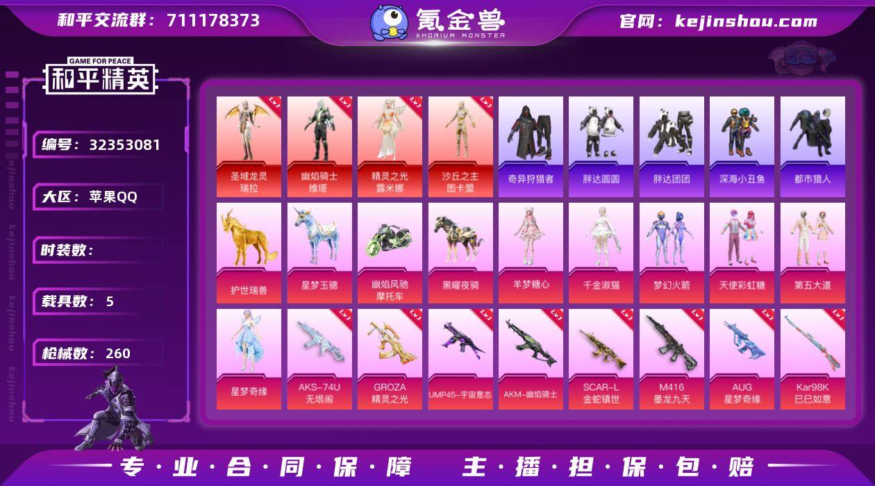 【ZG137】156套装/枪械15/装备360/载具5/战备187/王牌印记14/热力值99633/四级AKM-梦之光华/六级AKM-幽焰骑士/三级SCAR-L-金蛇镇世/一级M416-五爪金龙/六级M416-超新星/一级M416-墨龙九天/三级GROZA-精灵之光/七级AUG-星梦奇缘/三级UMP45-宇宙意志/六级AKS-74U-无垠阁/三级P90-沙丘之主/五级Kar98K-巳巳如意/三级Mk14-盛世惊鸿/一级Mk14-福马献瑞/五级DP-28-豹影疾电/一级圣域龙灵-瑞拉/一级幽焰骑士-维塔/一级精灵之光-露米娜/四级沙丘之主-图卡盟/圣域龙灵-瑞拉/幽焰骑士-维塔/精灵之光-露米娜/沙丘之主-图卡盟/梦幻火箭/浪漫天命/都市猎人/深海小丑鱼/小丑鱼/奇异狩猎者/胖达团团/胖达圆圆/龟仙人/潮萌小黄鸭/暗影哥特/Mark.06/天使彩虹糖/第五大道/星梦奇缘/千金淑猫/羊梦糖心/角色-虎痴许褚/幽焰风驰摩托车/星梦玉骢/护世瑞兽/黑曜夜骑/九霄玄鹿/AKM-梦之光华/AKM-幽焰骑士/SCAR-L-金蛇镇世/M416-五爪金龙/M416-超新星/M416-墨龙九天/GROZA-精灵之光/AUG-星梦奇缘/UMP45-宇宙意志/AKS-74U-无垠阁/P90-沙丘之主/Kar98K-巳巳如意/Mk14-盛世惊鸿/Mk14-福马献瑞/DP-28-豹影疾电/酣梦熊熊飞行器/炫彩糖果飞行器/祥瑞起舞飞行器/风花雪月飞行器/沙丘之主天马/镜域双华-灵镜之阶...