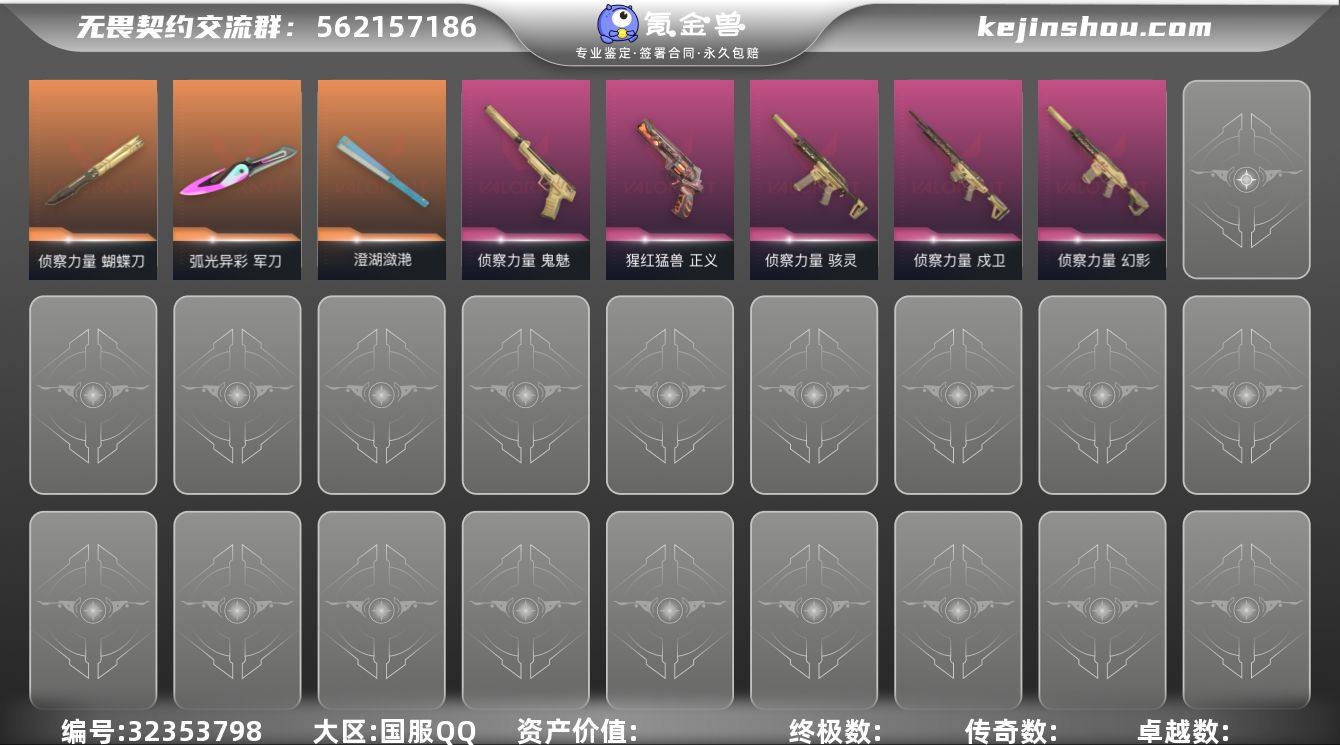 S193989(侦察力量套装)无畏契约/46等级/黑铁段位/15英雄/22皮肤/资产12590/已使用R点335/剩余R点35/侦察力量-戍卫,侦察力量-幻影,侦察力量-骇灵,侦察力量-鬼魅,侦察力量-蝴蝶刀,弧光异彩-军刀,澄湖潋滟,猩红猛兽-正义