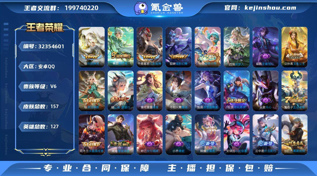 V7 6传说 262皮肤 126英雄 【6传说】狄仁杰-超时空战士,貂蝉-猫影幻舞,宫本武藏-地狱之眼,诸葛亮-时雨天司,桑启-鸣野蒿,后羿-神树通天【65史诗】元歌-无心,鬼谷子-五谷丰年,赵云-未来纪元,钟无艳-超时空战士,澜-赏金猎手,安琪拉-心灵骇客,百里守约-特工魅影,百里守约-朱雀志,百里玄策-原初追逐者,百里玄策-热力回旋,不知火舞-魅语,蔡文姬-舞动绿茵,蔡文姬-奇迹圣诞,曹操-幽灵船长,蔡文姬-繁星吟游,嫦娥-拒霜思,程咬金-功夫厨神,妲己-魅力维加斯,妲己-时之彼端,大乔-猫狗日记,狄仁杰-魔术师,狄仁杰-鹰眼统帅,貂蝉-圣诞恋歌,公孙离-无限星赏官,宫本武藏-鬼剑武藏,韩信-白龙吟,花木兰-水晶猎龙者,花木兰-默契交锋,橘右京-修罗,镜-匿光追影者,铠-曙光守护者,李白-千年之狐,李元芳-逐浪之夏,廉颇-地狱岩魂,刘邦-德古拉伯爵,刘禅-绅士熊喵,露娜-紫霞仙子,鲁班七号-电玩小子,吕布-圣诞狂欢,马可波罗-暗影游猎,蒙犽-狂想玩偶喵,米莱狄-胡桃异想国,墨子-金属风暴,上官婉儿-梁祝,裴擒虎-李小龙,孙策-猫狗日记,孙尚香-水果甜心,孙尚香-蔷薇恋人,孙尚香-时之恋人,王昭君-偶像歌手,小乔-缤纷独角兽,雅典娜-冰冠公主,亚瑟-心灵战警,杨戬-天秀·启明,嬴政-摇滚巨星,瑶-遇见神鹿,虞姬-霸王别姬,云中君-纤云弄巧,赵云-皇家上将,甄姬-冰雪圆舞曲,诸葛亮-黄金分割率,庄周-高山流水,狂铁-龙之律动,小乔-线条小狗,莱西奥-光弋星穹