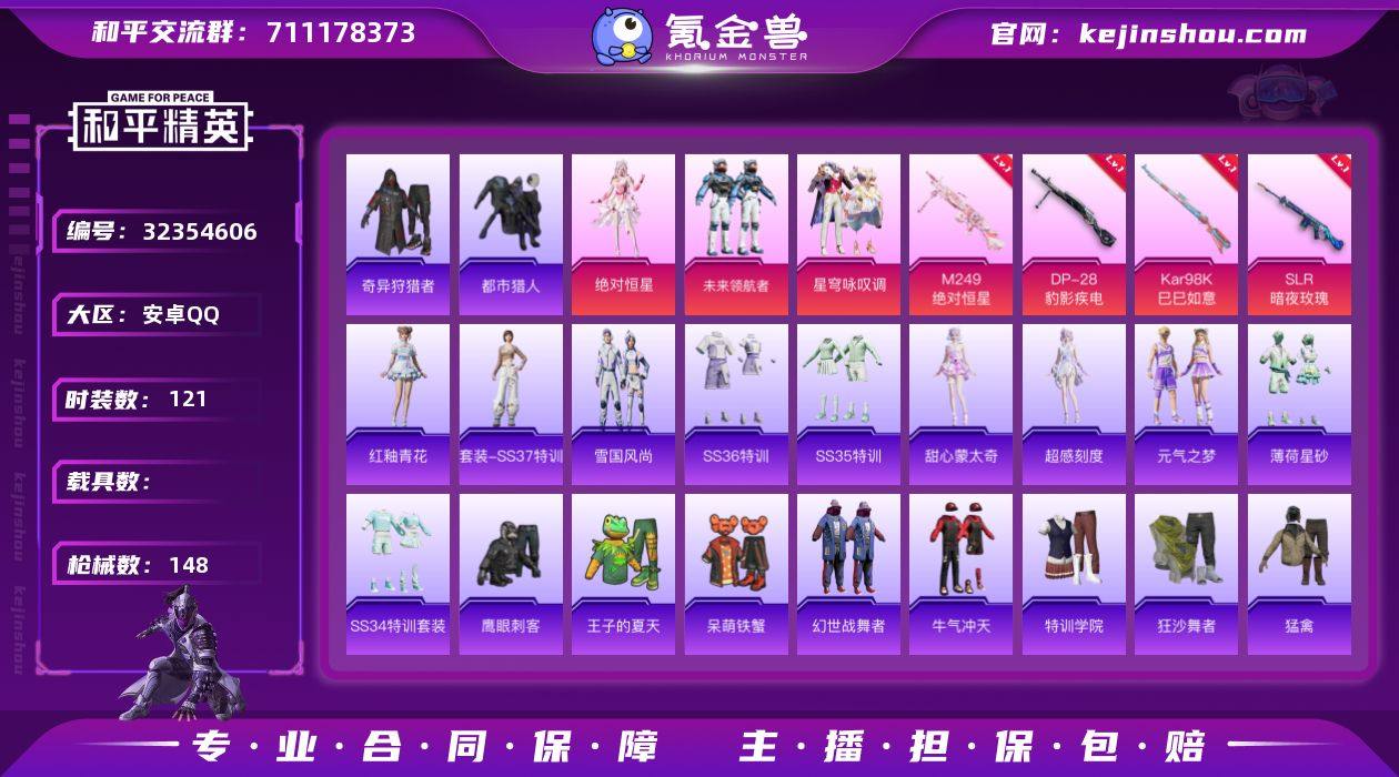 安卓 手Q-6粉装-4特效枪-2载具-8粉色飞行器-75715热力值-7王牌印记-157套装-230枪皮 【热门品类】:套装-浪漫天命,套装-龟仙人,套装-粉红小猪,角色-Mark.06 【粉色套装】:粉装-挚爱序曲,粉装-炎氏战神,角色-冰炎战车,角色-圣堂之誓,粉装-未来领航者,角色-荧海星豚 【粉色枪皮等级】:SCAR-L-锦绣绵绵(五级),UMP45-量子极限(五级),Kar98K-巳巳如意(五级),Mk14-甜梦熊击(五级) 【粉色载具】:永恒黄蜂,鬼马风驰 【粉色枪皮】:SCAR-L-锦绣绵绵,UMP45-量子极限,Kar98K-巳巳如意,Mk14-甜梦熊击 【粉色飞行器】:庄周梦蝶飞行器,萌物绒绒飞行器,镜光幻境飞行翼,霓虹漫游飞行器,英伦信使飞行器,万象金身飞行器,戏水时光飞行器 【粉色降落伞】:荒野猎神降落伞,环太平洋降落伞,飒粉甜心降落伞,白勺歌姬降落伞,闲梦青缨降落伞,超新星降落伞,圣堂之誓降落伞,夜幕颂歌降落伞,鎏金朋克降落伞,江南烟雨降落伞,星空武士降落伞,精灵梦叶罗丽降落伞,初号机 觉醒Ver.降落伞,忍者神龟降落伞,未来领航者降落伞,圣域龙灵降落伞,时光之吻降落伞,时光之誓降落伞,绯穹魔姬降落伞 【稀有套装】:套装-龟仙人,套装-雏菊兔兔,套装-萝兰蝴蝶,套装-小熊娃娃,套装-糖糖葫芦,套装-青团波波,角色-都市丽猫,角色-怀庆长公主,套装-燕燕于飞,套装-鱼渊荷华,套装-旋风灵鼠,套装-紫幽梦,套装-蓝冰羽,角色-瑰梦爱神,套装-彩虹兔,套装-云朵鹅,套装-雪绒豹,角色-乐音,套装-朱霞炽焰 【稀有枪皮】:AKM-彩虹符号,AKM-环太平洋,AKM-破晓战魂,AKM-霓虹街区,AKM-龙的传人,AKM-棋盘冕主,M16A4-幻世战舞者,M16A4-甜心亚梦,SCAR-L-夜灯,SCAR-L-玉兔迎春,SCAR-L-红色方程式,M416-糯团青竹,M416-红色方程式,M416-蓝色火焰,GROZA-影袭,GROZA-懵萌河马,GROZA-田园牧歌,AUG-天降萌叽,AU...