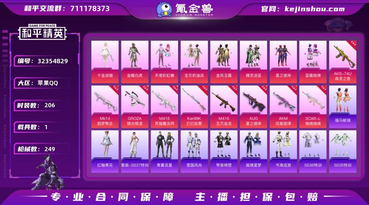 苹果 手Q-1神装-6粉装-4特效枪-1载具-6粉色飞行器-40573热力值-7王牌印记-73套装-116枪皮 【红色神装等级】:最终圣卫者-帕修斯(二级) 【红色角色神装】:最终圣卫者-帕修斯 【热门品类】:套装-深海小丑鱼,套装-龟仙人,角色-8号机,角色-Mark.06 【粉色套装】:角色-呆萌星弥,粉装-炫光之旅,角色-初号机 觉醒Ver.,角色-千金淑猫,角色-冷漠罗丽,角色-罗征 【粉色枪皮等级】:UMP45-宇宙意志(三级),Vector-最终圣卫者(三级),Kar98K-巳巳如意(五级),PKM-江南烟雨(七级) 【粉色载具】:星梦玉骢 【粉色枪皮】:UMP45-宇宙意志,Vector-最终圣卫者,Kar98K-巳巳如意,PKM-江南烟雨 【粉色飞行器】:萌物绒绒飞行器,星梦奇缘飞行器,深渊漩涡飞行器,曦光华影飞行器,脆鲨七海飞行器,终晖之翼飞行器 【粉色降落伞】:第五大道降落伞,蜜语绒猫降落伞,江南烟雨降落伞,精灵梦叶罗丽降落伞,星梦奇缘降落伞,月影灵韵降落伞,樱桃泡泡降落伞,雪月幻音降落伞,智耀战神降落伞,最终圣卫者降落伞,冷漠罗丽降落伞 【稀有套装】:套装-龟仙人,套装-绒宝小鹅,套装-巳巳如意,套装-雏菊兔兔,套装-萝兰蝴蝶,套装-小熊娃娃,套装-糖糖葫芦,套装-青团波波,套装-棉花软糖,角色-都市丽猫,角色-摩登魅猫,套装-燕燕于飞,套装-鱼渊荷华,套装-晶灵使者,套装-晶辉守护,套装-萌萌史莱姆,套装-紫幽梦,套装-蓝冰羽,角色-瑰梦爱神,套装-云朵鹅,套装-雪绒豹 【稀有枪皮】:M16A4-最终圣卫者,M16A4-千金淑猫,M416-萌萌史莱姆,AUG-甜蜜菠萝,AUG-耀粉歌者,M762-第五大道,M762-云朵鹅,UZI-魔药课室,Vector-焰鹰斗篷,Vector-生命誓言,汤姆逊-炫彩节奏,野牛-最终圣卫者,P90-巳巳如意,Kar98k-最终圣卫者,AWM-焰鹰斗篷,Mini14-旋转彩虹,Win94-晶梦幻蝶,SVD-云朵鹅,S686-蜜语绒猫,S686-生命誓言,S...