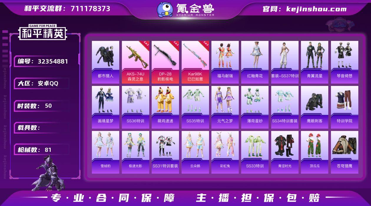 【都市男神星河浪客5特效枪 秒换绑不用等】 安卓Q区-19214热力值-50套装-81枪皮 【2稀有】 都市猎人 星河浪客【5特效枪】 AKS-74U-森灵之息(5级) Mk14-福马献瑞(5级) AA12-G-萌骑幻想(5级) Kar98K-巳巳如意(5级) DP-28-豹影疾电(5级)【102热门】 都市猎人(蓝口罩) 白色伏地魔 AUG-幻影战神 M762-彩虹符号 鹰眼刺客 破蛋小黄鸡 特训学院 青涩时光 青年教官 魅力单车 猎鹰 蓝色运动 黄色运动 漫步者 黄色伏地魔 红色运动 黑色伏地魔 S1897-糯团青竹 AA12-G-雨过天青 沙漠之鹰-雨过天青 平底锅-画境星梦 P90-紫矿核心 GROZA-紫矿核心 M16A4-雨过天青 顶瓜瓜 SPAS-12-福马献瑞 雨过天青 F57-魔童闹海 敖闰 MG-36-薄荷星砂 GROZA-福马献瑞 恋语绒绒 SS34特训 S1897-荧海星豚 撬棍-冰晶雪宝 AWM-天降萌叽 福马献瑞 大橘大利 彩虹兔 ACE32-冰晶雪宝 鱼渊荷华 青翼流星 燕燕于飞 SS31特训 SS33特训 SS32特训 极速光影 雪绒豹 MG3-霓彩脉冲 SS36特训 异域银装 G36C-桃粉嫣然 蜜獾-启元战纹 马上有钱 云朵鹅 Kar98K-星穹咏叹调 狙击之神 破片手榴弹-海盐豹豹 UMP45-海盐豹豹 M417-玩趣呆呆 Mk14-薄荷星砂 AUG-紫晶流影 AMR-鸡智如我 燃烧瓶-福马献瑞 ACE32-画境星梦 M1加兰德-画境星梦...