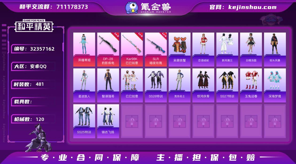 【特价出售】安卓Q-1粉装3特效枪5热门114套装120枪皮 34111热力值 1印记 历史超级王牌1星 【1粉装】 异瞳寒姬 【3特效枪】 Kar98K-巳巳如意 (5级) DP-28-豹影疾电 (5级) SLR-暗夜玫瑰 (4级) 【5热门】 龟仙人 呆萌铁蟹 抹茶蜜豆 破蛋小黄鸡 极速红龙