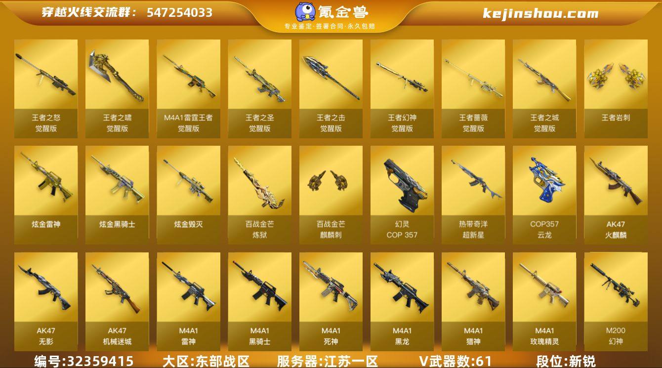 【935452】江苏一区-75V-15王者武器数-3炫金武器数 【传说角色】:传说艾莉莎 【热门武器】:QBZ03-金色蔷薇,Scar Light-白虎,M200-幻神,Kar98K-星神,M4A1-黑骑士,羊驼玩偶,COP-白鲨,COP 357-幻灵,沙鹰-修罗*6 【王者炫金武器】:王者岩刺,炫金骑士,炫金雷神,炫金毁灭 【音效卡】:M200-幻神音效卡,M4A1-雷神音效卡,Barrett-毁灭音效卡,绝迹语音包,Kar98K-星神音效卡,炼狱-百战金芒-庆典舞曲音效卡 【皮肤】:M200-幻神-黄忠皮肤,幻神-丹凤,幻神-宠儿-2021MVP,幻神-纸灯龙皮肤,幻神-电流骇客 皮肤,幻神-星火小队签名臻藏版 皮肤,ScarLight-白虎-冠军之虎皮肤,白虎-热带奇洋 皮肤,金色蔷薇-枪娘阿敏 皮肤,Kar98K-星神-冠军之星皮肤,雷神-暗月,雷神-荣耀之魄,雷神-虎将,雷神-传奇N9,雷神-宠儿-2019MVP,雷神-R.LGD-CFPLS18冠军,雷神-宇航兔皮肤,雷神-源计划2.0专属 皮肤,M4A1-再燃火线,火麒麟-雷神,火麒麟-冠军之心,火麒麟-战神关羽,传奇石头-横秒之巅,火麒麟-心动糖果,毁灭-暗月,毁灭-荣耀之怒,毁灭-SV-CFPLS16冠军,毁灭-风暴,M4A1-千变-孔明皮肤,黑龙-能量核心,黑龙-冠军之武,黑骑士-冠军之势,黑骑士-AG-S4冠军典藏,黑骑士-...