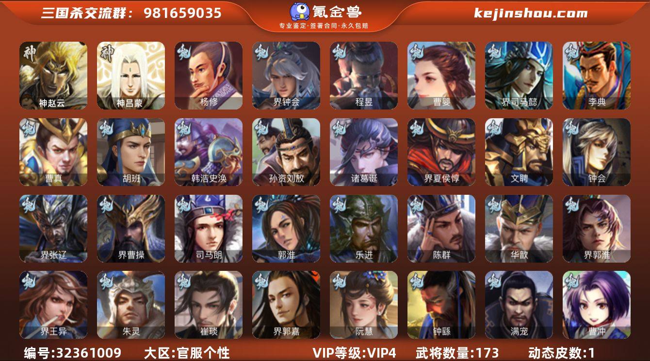 大材料中军,36宝珠,8万羽毛,8万豆,金皮郑玄,神赵云,曹婴,界钟会,左慈,程昱7史诗中军,神吕蒙,回廊动李儒,崔琰,势陈到,甘夫人,谋卢植,濮阳兴,孙翊,孙茹,凌操,金皮界吕布,界全琮,界朱治,阮慧,界曹植,胡班,吴班,界简雍,界马超,孙邵,贾充,界刘表,王濬173将,国战59将,满级活树