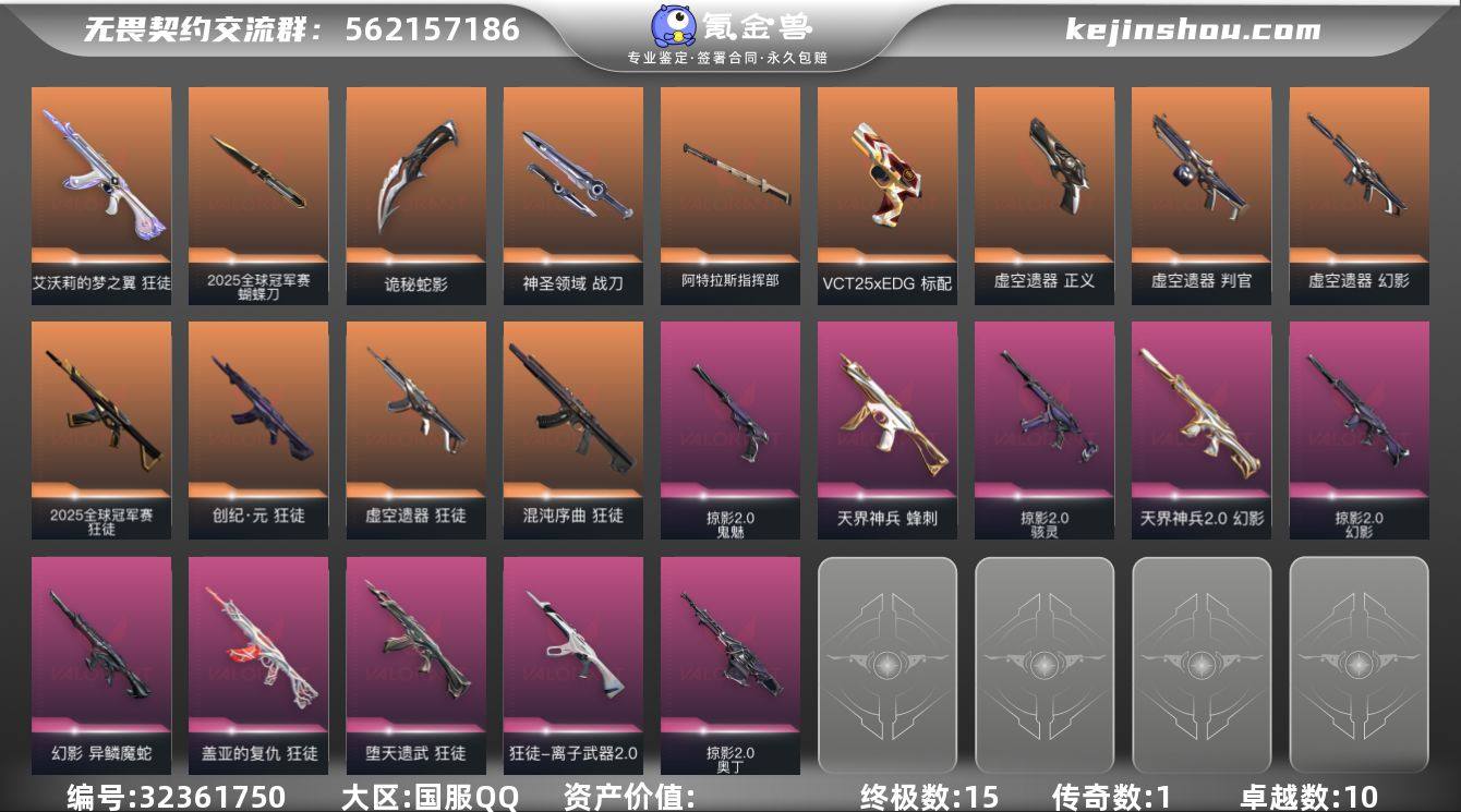 【935796】【套装】:2025全球冠军赛套装,虚空遗器套装,掠影//2.0套装 【英雄】:幻棱,炼狱,维斯,暮蝶,钛狐,壹决,铁臂,捷风,雷兹,幽影,不死鸟,贤者,猎枭,蝰蛇,零,芮娜,奇乐,尚勃勒,霓虹,夜露,星礈,K/O,盖可,黑梦,钢锁 【近战武器】:近战武器-2025全球冠军赛 蝴蝶刀,近战武器-影钩,近战武器-威龙之刃,近战武器-源始幻刃,近战武器-诡秘蛇影 军刀,近战武器-神圣领域 战刀,近战武器-阿特拉斯指挥部 甩棍 【狂徒】:狂徒-2025全球冠军赛,狂徒-混沌序曲,狂徒-创·纪元,狂徒-虚空遗器,狂徒-艾沃莉的梦之翼,狂徒-堕天遗武,狂徒-盖亚的复仇,狂徒-离子武器//2.0,狂徒-诡秘蛇影 【幻影】:幻影-虚空遗器,幻影-天界神兵//2.0,幻影-异鳞魔蛇,幻影-掠影//2.0,幻影-神圣领域,幻影-末日之翼 【戍卫】:戍卫-月球哨兵,戍卫-折光棱晶 【獠犬】:獠犬-神圣领域 【冥驹】:冥驹-星云暗涌 【飞将】:飞将-末日之翼 【莽侠】:莽侠-诡秘蛇影,莽侠-月球哨兵 【战神】:战神-神圣领域,战神-采蜜小蜂队 【奥丁】:奥丁-掠影//2.0,奥丁-末日之翼 【判官】:判官-虚空遗器,判官-超能偶像,判官-诡秘蛇影,判官-采蜜小蜂队 【雄鹿】:雄鹿-月球哨兵 【...