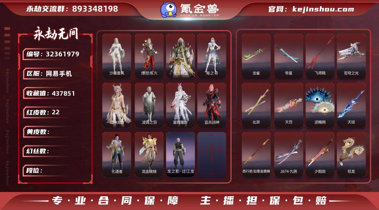 YJJ1910/365换绑/等级383/s19三人蚀月1/22红690金收藏值437851/星辉魔纱/化生明王/熛怒炼火/泣珠龙纱/海之奇/凌霄之羽/沙漠香风/监兵凶神/化道者/流金晓锦/天罚/苍穹之光/少阳剑/2674·九阴/帝星/比羿/龙雀/飞将戟/西行劫·如意金箍棒/天琼/逆晦朔/狂龙/2674·初代机/珥冰/观山海·春木/御翔云/炎烈珠/龙之影·过江龙/铠甲勇士·帝皇侠/荆魂/应龙号/西行劫·神君印/不凡·幻梦秘匙/夜蔷薇/噬骨/龙之道·灵心/幻丝293857/已绑定手游/