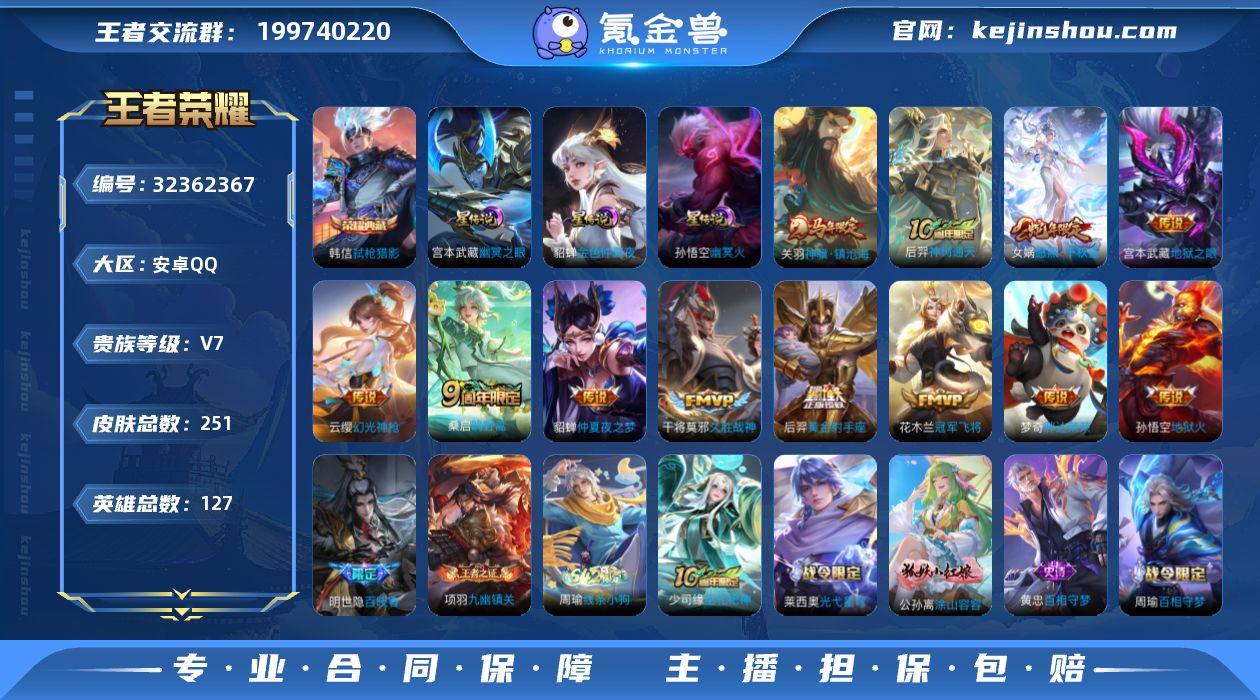 【932781】安卓WX-V7-永恒钻石II段位-126英雄-218皮肤-1典藏皮肤-1珍品传说-12传说-71限定-7印记-13按键 【英雄全皮】:孙权全皮,影全皮 【荣耀典藏】:韩信弑枪猎影 【珍品传说】:孙策时之奇旅 【传说皮肤】:后羿神树通天,公孙离云诺千山,澜愿照九州拓,桑启鸣野蒿,典韦战鼓燎原,孙尚香乘龙问璇玑,马超琥珀纪元,曜山海苍雷引,马超无双飞将,镜炽阳神光,李信一念神魔,宫本武藏地狱之眼 【限定皮肤】:虞姬夏日便利店,狄仁杰阴阳师,赵云皇家上将,孙尚香蔷薇恋人,高渐离玩趣恶龙,元歌无心,马可波罗山海玄木吟,狄仁杰魔术师,达摩沙漠行僧,项羽海滩派对,兰陵王金庭之子,孙悟空孙行者,李元芳云中旅人,钟馗驱傩正仪,鬼谷子五谷丰年,沈梦溪大漠名商,裴擒虎李小龙,裴擒虎擒涛扼浪,云中君纤云弄巧,盾山梦圆繁星,上官婉儿梁祝,嫦娥拒霜思,曜山海苍雷引,鲁班大师探海日志,桑启海盐诗旅,艾琳流音漫舞,司空震地狱燃心,阿古朵江河有灵,张良古海寻踪,蒙犽百解令,蒙恬荣光圣徽,高渐离燃音魔法,妲己灵卜魔法,鬼谷子天穹祈灯,马超琥珀纪元,孙尚香乘龙问璇玑,刘邦剑破天穹,项羽苍威无极 【年限皮肤】:曜山海苍雷引,马可波罗山海玄木吟,孙尚...