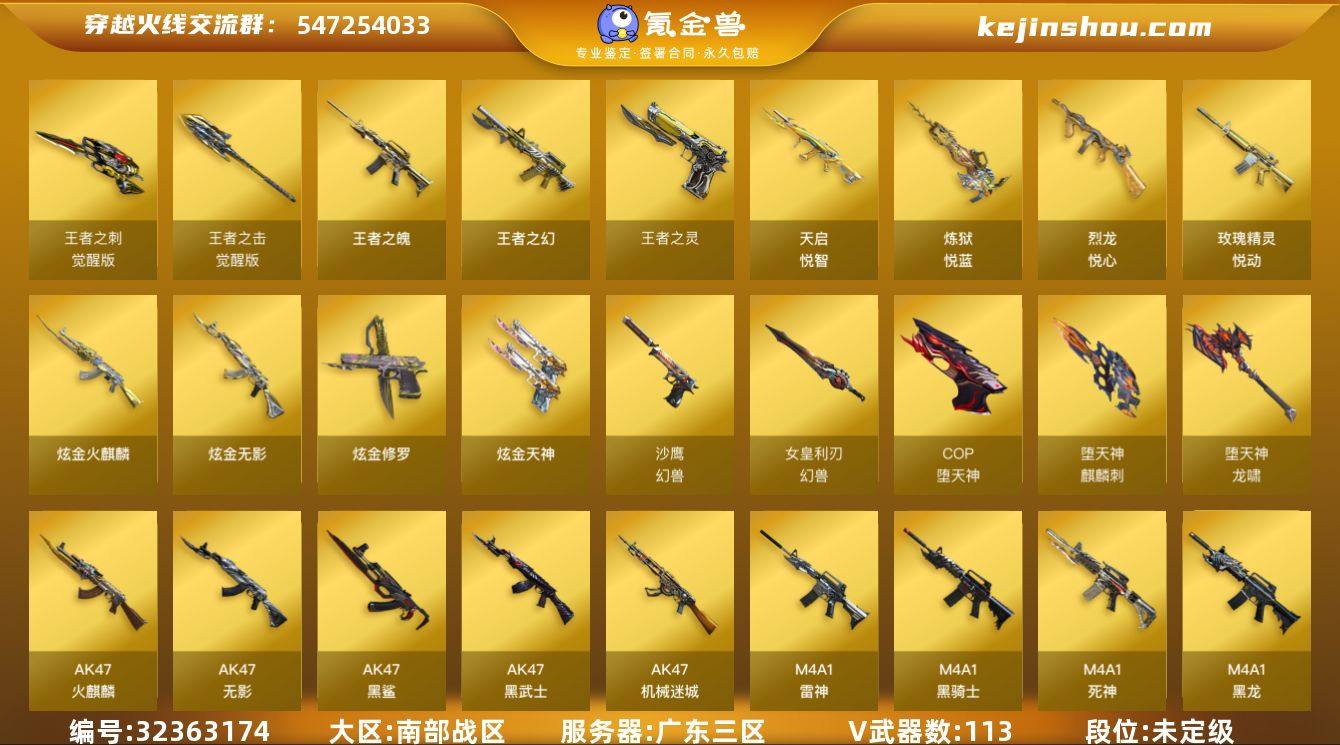 广东三区-121V-13王者武器数-4炫金武器数 【热门武器】:QBZ03-金色蔷薇,M200-幻神,金色小号,M4A1-黑骑士,汤姆逊-烈龙*3,RPK-盘龙,加特林-炼狱*8,COP-堕天神*2,沙鹰-修罗*5,高爆手雷-幻兽 【王者炫金武器】:天启-悦智,王者之幻,玫瑰精灵-悦动,王者之魄*2,炼狱-悦蓝*2,烈龙-悦心,王者之灵,炫金火麒麟,炫金无影,炫金天神,炫金修罗 【音效卡】:M4A1-黑骑士音效卡,Barrett-毁灭音效卡 【皮肤】:雷神-暗月,雷神-星空,火麒麟-雷神,毁灭-暗月*2,毁灭-荣耀之怒,毁灭-星空,黑龙-能量核心,黑龙-暗月,黑骑士-暗月*2,黑骑士耀金皮肤,无影-暗月*3,死神-秘银,战神-粉色甜心皮肤*2,战神-紫绶金章皮肤*2,战神-流金岁月皮肤*4,天龙-能量核心,AWM-天龙-传奇白鲨,极光-能量核心,修罗-能量核心*2,天神-暗月*2,屠龙-荣耀之锋 【角色】:葵,樱,迷迭香,王者-零,狐影,乔伊教练,风暴女,娟娟,兰-海滩派对,曼陀罗-X,潘多拉-X,铁骑荣耀,影武者-X 【人偶武器】:火麒麟-灵狐,巴雷特-零-水下丽影,COP-旗袍,闪光弹-小乔 【挑战大师】:神圣爆裂者III,激光毁灭者III 【英雄级武器】:AK47-火麒麟*2,M4A1-黑龙*3,M4A1-雷神*3,M4A1-黑骑士,AK47-...