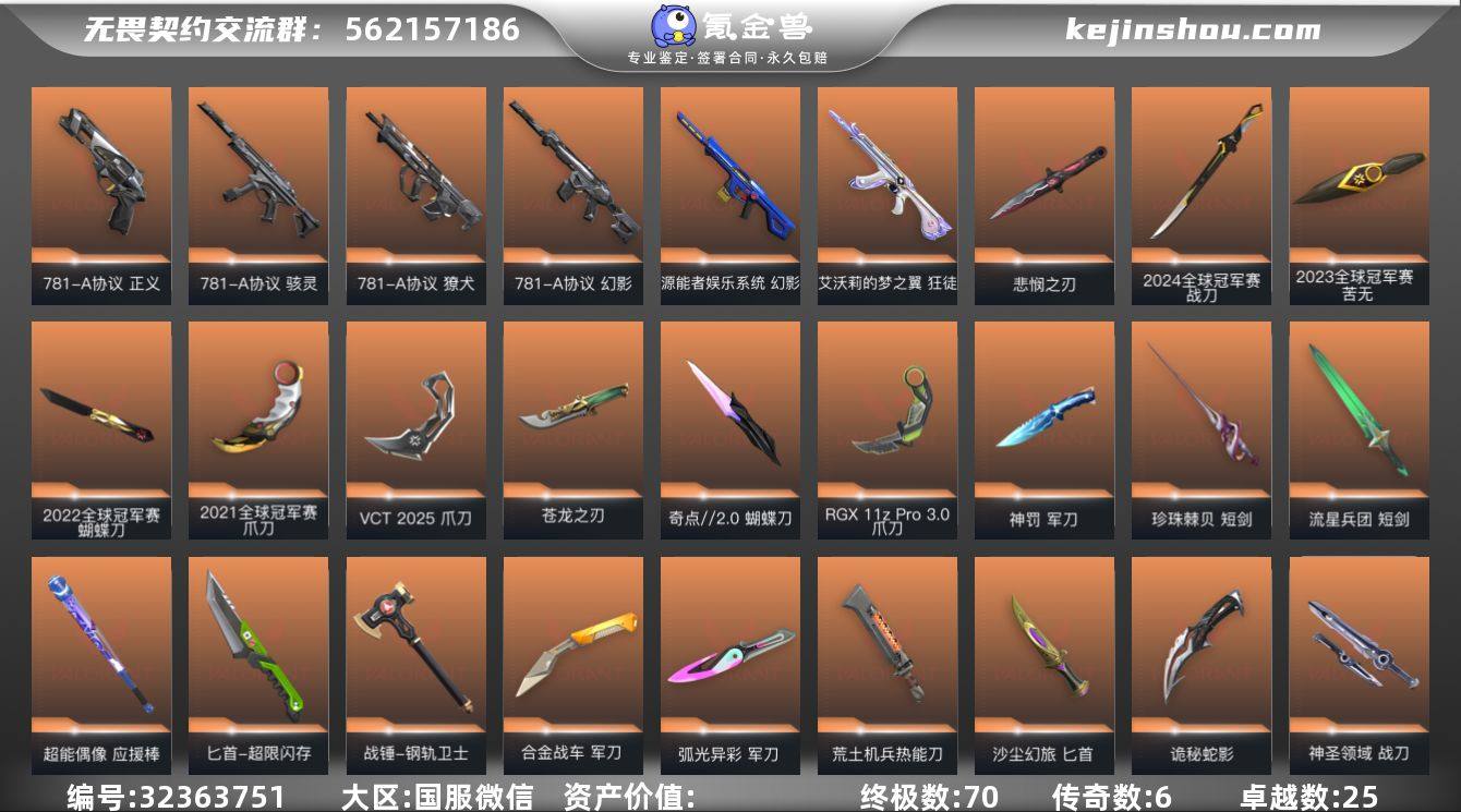 【936031】【套装】:离火刃套装,2024全球冠军赛套装,2023全球冠军赛套装,2022全球冠军赛套装,2021全球冠军赛套装,781-A协议套装,无畏契约季前邀请赛套装,VCT 2025 赛季套装,RGX 11z Pro//3.0套装,离火刃套装,《英雄联盟:双城之战》套装,全息波普套装,全息波普//2.0套装,VCTxEDG 队伍套装,紫阙金琅套装 【英雄】:幻棱,炼狱,维斯,暮蝶,钛狐,壹决,铁臂,捷风,雷兹,幽影,不死鸟,贤者,猎枭,蝰蛇,零,芮娜,奇乐,尚勃勒,霓虹,斯凯,夜露,星礈,K/O,海神,盖可,黑梦,钢锁 【近战武器】:近战武器-2024全球冠军赛 战刀,近战武器-2023全球冠军赛 苦无,近战武器-2022全球冠军赛 蝴蝶刀,近战武器-2021全球冠军赛 爪刀,近战武器-碎心裂刃,近战武器-无畏契约季前邀请赛 悲悯之刃,近战武器-5周年//公测重制版 苍龙之刃,近战武器-穿花蝴蝶,近战武器-剥皮小刀,近战武器-奇点//2.0 蝴蝶刀,近战武器-VCT 2025 爪刀,近战武器-RGX 11z Pro//3.0 爪刀,近战武器-离火刃,近战武器-落英飞旋,近战武器-威龙之刃,近战武器-珍珠棘贝 短剑,近战武器-流星兵团 短剑,近战武器-超能偶像 应援棒,近战武器-超限闪存 匕首,近战武器-钢轨卫士 战锤,近战...