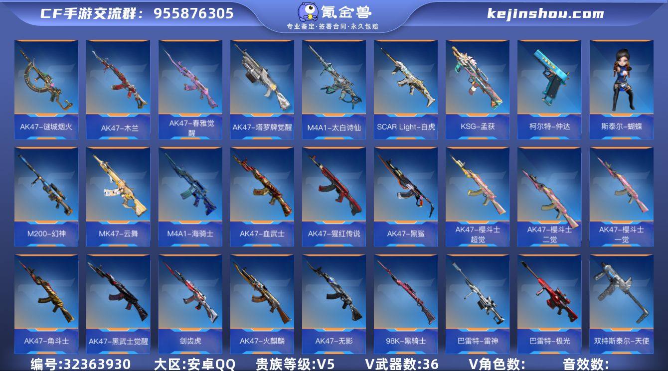 x1924 VIP5级,王尊,冰皮王者幻神,AK奉先,M4星象,M4卧龙觉醒,KSG孟获,狙击枪线2【王者武器】:王者之尊,王者幻神;【三国武器】:AK47-奉先,M4A1-星象,M4A1-卧龙觉醒,KSG-孟获,柯尔特-仲达;【热门武器】:AK47-角斗士,AK47-黑武士觉醒,AK47-火麒麟,AK47-无影,AK47-猩红传说,AK47-樱斗士-二觉,M4A1-雷神,M4A1-黑骑士,AK47-黑鲨,AK47-木兰,AK47-谜城烟火,AK47-春雅觉醒,AK47-塔罗牌觉醒,AK47-血武士,M4A1-海骑士,M4A1-猎神,M4A1-运输船,M4A1-夏清,M4A1-心动次元觉醒,M4A1-幻灵,SCAR-守护者觉醒,M4A1-铁胆虎魄,剑齿虎,SCAR-探星者,M4A1-太白诗仙,M4A1-夏清觉醒,SCARLight-白虎,M14EBR-葫芦山庄,9A91-天神,M16-恶魔,HK417-炎龙铠甲,HK417-朱雀,81式-光明之神,QBZ03-金色蔷薇,G36-李星云,SBR-湮灭,G36-机械纪元,AWM-裁决,MK47-云舞,Ash-马上来财,AWM-天使,巴雷特-毁灭,巴雷特-极光,巴雷特-雷神,AWM-指南针,M200-幻神,09式狙-天神,巴雷特-冬灭,98K-星神,98K-血月,VSK-94-金蚀,98K-黑骑士,GM6-战争风云觉醒,TAC-晴舞,刘易斯-天使,双持斯泰尔-天使,斯泰尔-蝴蝶,QBB95-极光,CZS2-血月,CZS2-心动次元,双持CZS2...