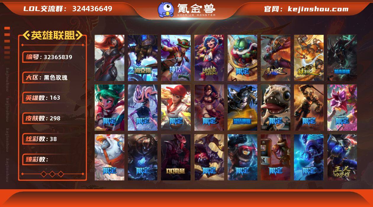 【935677】未定级段位-163英雄-298皮肤-38炫彩-1终极-3神话-53限定-23传说-77史诗 【神话皮肤】:十周年纪念安妮,十五周年纪念希维尔,海克斯科技阿利斯塔 【年限皮肤】:定海神珍孙悟空,替父从军花木兰,美猴王孙悟空 【海克斯皮肤】:海克斯科技阿利斯塔 【冰雪限定】:幸福女神乐芙兰,圣诞开心鬼提莫,圣诞精灵崔丝塔娜,圣诞糖果棒厄运小姐,阿木木“主人不要我了”,胡桃夹子萨科,英勇玩具兵普朗克,邪恶圣诞老人维迦,夺命美人卡特琳娜,喜庆之树茂凯,圣诞玩偶波比,圣诞老人古拉加斯,魄罗骑士瑟庄妮,冰雪女神辛德拉 【终极皮肤】:武装战姬厄运小姐 【限定皮肤】:送披萨的小姐姐希维尔,冠军典狱长锤石,Fnatic库奇,暗杀星奥莉安娜,暗杀星蒙多,暗杀星努努和威朗普,SSW图奇,SSW泰隆,SSW雷恩加尔,SKTT1阿利斯塔,SKTT1瑞兹,安妮梦游仙境,胜利女神莫甘娜,胜利女神希维尔,胜利之树茂凯,胜利枪神格雷福斯,胜利女神奥莉安娜,海贼瑞兹,南瓜头费德提克,鬼影森森茂凯,糖果使徒费德提克,机械迷城加里奥,蓝色忧郁崔斯特,女猎手希维尔,外星装甲库奇,暗影沃里克,波比的巧克力工坊,都铎王朝图奇,红桃杰克崔斯特,防暴机器人布里茨,防暴士兵辛吉德,...