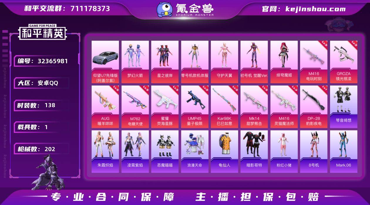 【特价出售/店主推荐】安卓 手Q-6粉装-11特效枪-1载具-3粉色飞行器-56175热力值-7王牌印记-138套装-202枪皮 【热门品类】:粉装-梦幻火箭,套装-浪漫天命,套装-龟仙人,套装-暗影哥特,套装-粉红小猪,角色-8号机,角色-Mark.06 【粉色套装】:粉装-梦幻火箭,粉装-星之彼岸,角色-零号机款机体服,角色-守护天翼,角色-初号机 觉醒Ver.,角色-绯穹魔姬 【粉色枪皮等级】:M416-电玩时刻(五级),M416-灵猫魔法师(三级),GROZA-镜光银凌(五级),AUG-暖羊咩咩(五级),M762-电糖天使(五级),蜜獾-荧海星豚(五级),UMP45-量子极限(五级),Kar98K-巳巳如意(五级),Mk14-甜梦熊击(五级),Mk14-福马献瑞(一级),DP-28-豹影疾电(一级) 【粉色载具】:仰望U7(阿盖尔紫) 【粉色枪皮】:M416-电玩时刻,M416-灵猫魔法师,GROZA-镜光银凌,AUG-暖羊咩咩,M762-电糖天使,蜜獾-荧海星豚,UMP45-量子极限,Kar98K-巳巳如意,Mk14-甜梦熊击,Mk14-福马献瑞,DP-28-豹影疾电 【粉色飞行器】:镜域双华-灵镜之阶,星空武士飞行器,龙翔九天飞行器 【粉色降落伞】:梦幻火箭降落伞,星夜魔法师降落伞,冰川粉黛降落伞,沙丘之主降落伞,镜域双华降落伞,江南烟雨降落伞,初号机 觉醒Ver.降落...