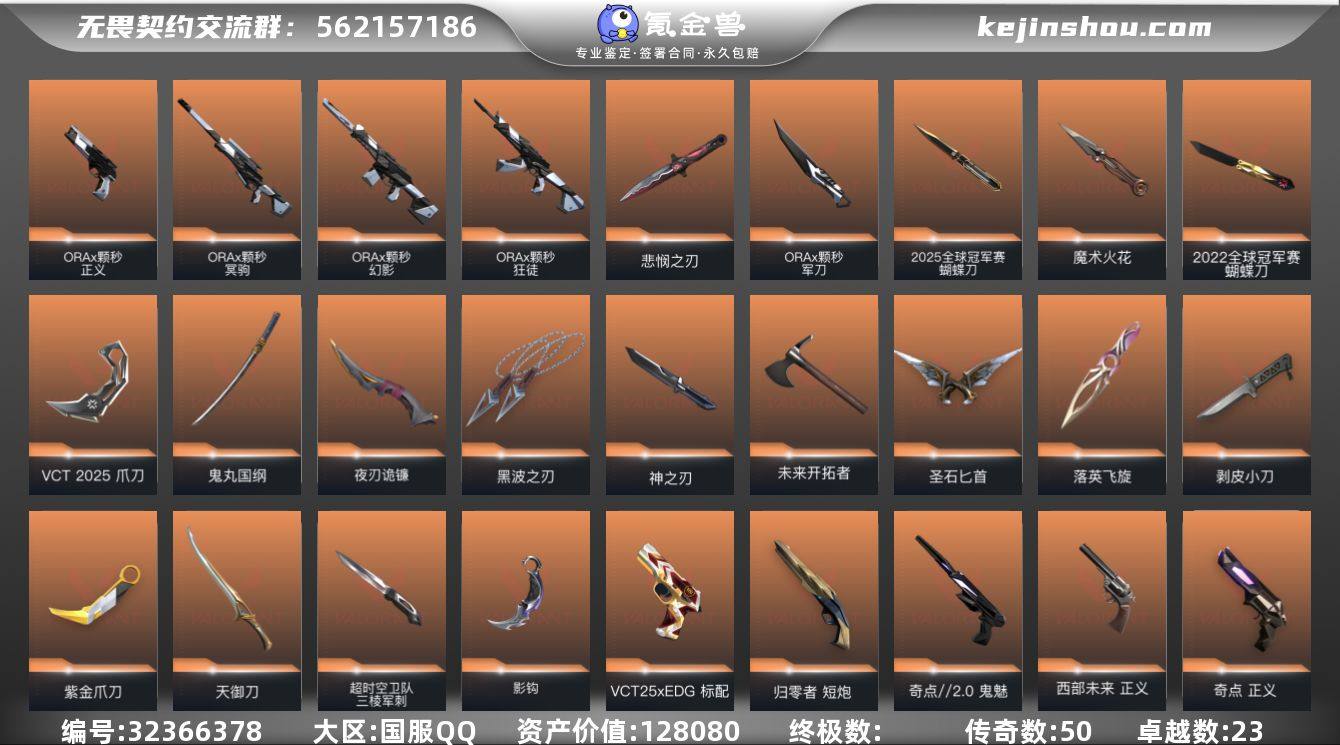 【自带包赔 可赔三倍】:库存价值128080 限定22 25 VCT爪刀 双城狂徒 12w大库存号 性价比超值 【限定】: 无畏契约季前邀请赛 悲悯之刃, 2025全球冠军赛 狂徒, 2025全球冠军赛 蝴蝶刀, 2022全球冠军赛 幻影, 2022全球冠军赛 蝴蝶刀, VCT 2025 爪刀, 双城之战 狂徒 【近战】: 天御刀, 超时空卫队 三棱军刺, 无畏契约季前邀请赛 悲悯之刃, 未来开拓者, 2025全球冠军赛 蝴蝶刀, 魔术火花, 黑波之刃, 紫金爪刀, 影钩, 2022全球冠军赛 蝴蝶刀, 圣石匕首, 神之刃, 剥皮小刀, 夜刃诡镰, VCT 2025 爪刀, 落英飞旋, 鬼丸国纲 【狂徒】: 盖亚的复仇 狂徒, 堕天遗武 狂徒, 光荣异象 狂徒, 创·纪元 狂徒, 多弥尔的复仇 狂徒, 机动狂飙 狂徒, 2025全球冠军赛 狂徒, 日冕雄师 狂徒, 紫阙金琅 狂徒, 冰点凝冻 狂徒, RGX 11z Pro 狂徒, 洪荒怒焰 狂徒, 离子武器//2.0 狂徒, 混沌序曲 狂徒, 塑水宗 狂徒, 掠影 狂徒, 双城之战 狂徒 【幻影】: 般若假面 幻影, 末日泡泡 幻影, 2022全球冠军赛 幻影, 异鳞魔蛇 幻影, 神中神罚 幻影, 侦察力量 幻影, 千灵华绽 幻影 【冥驹】: 离子武器 冥驹, 堕天遗武 冥驹 【正义】: 掠影//3.0 追猎, 千灵华绽 正义, 离子武器 正义, 塑水宗 正义, 奇点 正义,...