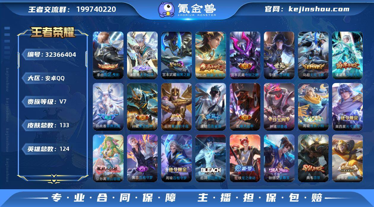 安卓Q-V8-永恒钻石III段位-125英雄-205皮肤-1典藏皮肤-18传说-45史诗 【英雄全皮】:影全皮 【荣耀典藏】:铠银白咏叹调 【传说皮肤】:后羿神树通天,公孙离云诺千山,妲己愿照众生和,澜愿照九州拓,桑启鸣野蒿,典韦战鼓燎原,澜逐花归海,诸葛亮鹤羽星尊,孙悟空齐天大圣,李信山海炽霜斩,马超无双飞将,赵云淬星耀世,铠绛天战甲,虞姬启明星使,孙悟空零号赤焰,曜云鹰飞将,李信一念神魔,达摩黄金狮子座 【限定皮肤】:蔡文姬夏日便利店,虞姬夏日便利店,姜子牙天穹之誓,狄仁杰阴阳师,赵云皇家上将,马可波罗山海玄木吟,狄仁杰魔术师,项羽海滩派对,韩信傲雪梅枪,兰陵王金庭之子,孙悟空大圣娶亲,孙悟空零号赤焰,孙悟空齐天大圣,刘备百相守梦,李元芳云中旅人,虞姬启明星使,杨戬潮玩骑兵,干将莫邪胡桃夹子,诸葛亮鹤羽星尊,黄忠火炮绅士,沈梦溪大漠名商,裴擒虎擒涛扼浪,李信山海炽霜斩,鲁班大师探海日志,艾琳流音漫舞,司空震地狱燃心,阿古朵江河有灵,张良古海寻踪,鬼谷子天穹祈灯,沈梦溪龙舞盛年,鲁班七号蔬乡物语,李元芳蔬乡物语,刘邦剑破天穹,程咬金群星魔术团,镜青焰无极,项羽苍威无极,刘备异域游侠,周瑜熔金海岸 【年限皮肤】:...