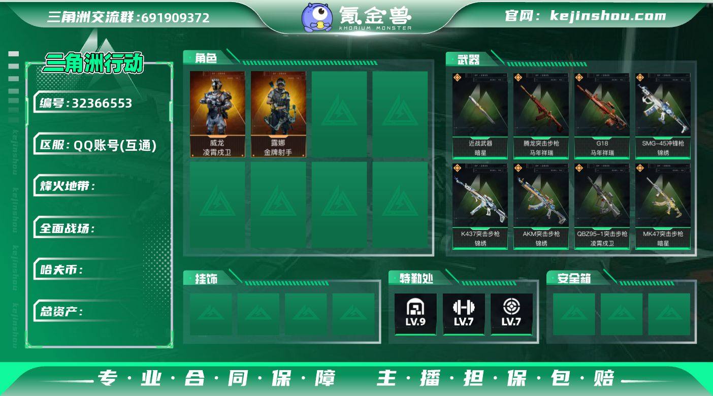 YQ-总资产170m/哈夫币23m/部门23332 【凌霄戍卫/暗星/锦绣套 露娜-运动员 s8赛季3x3已出 仓库9级 训中满级 靶场满级 aw*46】 等级 60 烽火段位 三角洲巅峰 橙:AKM锦绣,K437锦绣,SMG锦绣,腾龙马年祥瑞,G18马年祥瑞,QBZ凌霄戍卫,MK47暗星,SR暗星,SG552运动员, 刀:近战暗星, 限时道具/段位以实际验号为准。如账号因没有维护,赛季更新等不可抗因素发生变化,不属于账号质量问题差""