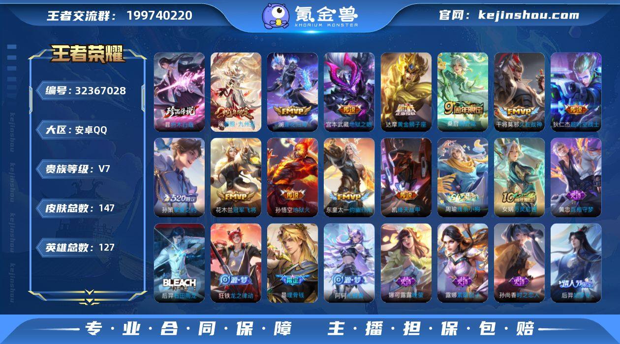 安卓Q-V7-最强王者段位-127英雄-147皮肤-2珍品传说-12传说-39史诗【英雄全皮】:敖隐全皮【珍品传说】:伽罗沧流箭,暃朽木白哉【传说皮肤】:澜愿照九州拓,桑启鸣野蒿,澜逐花归海,东皇太一灼幽烈阳,孙策挚爱之约,铠绛天战甲,干将莫邪久胜战神,达摩黄金狮子座,花木兰冠军飞将,宫本武藏地狱之眼,孙悟空地狱火,狄仁杰超时空战士【限定皮肤】:暃埋骨钱,姜子牙天穹之誓,狄仁杰阴阳师,廉颇寅虎御盾,赵云皇家上将,赵云百木心枪,白起夜都怪侠,芈月幻夜卜梦,狄仁杰魔术师,达摩沙漠行僧,项羽海滩派对,兰陵王金庭之子,后羿如梦令,李元芳云中旅人,钟馗驱傩正仪,鬼谷子五谷丰年,黄忠火炮绅士,沈梦溪大漠名商,明世隐吟游魔法,伽罗天狼溯光者,孙策挚爱之约,桑启海盐诗旅,艾琳女武神,张良古海寻踪,蒙犽百解令,鬼谷子天穹祈灯,沈梦溪龙舞盛年,周瑜熔金海岸【年限皮肤】:廉颇寅虎御盾,澜愿照九州拓【赛季限定】:钟馗驱傩正仪,达摩沙漠行僧,兰陵王金庭之子,沈梦溪大漠名商,李元芳云中旅人,桑启海盐诗旅,张良古海寻踪,鬼谷子天穹祈灯,姜子牙天穹之誓,东皇太一噬灭天穹,太乙真人谧流熔炉,钟馗虚灵犬护,甄姬逆浪荇歌,亚瑟荣光之誓【战令限...