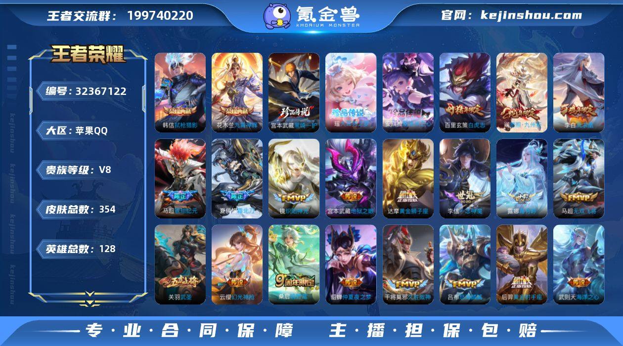 苹果Q-V8-最强王者段位-128英雄-354皮肤-2典藏皮肤-3珍品传说-24传说-87史诗【英雄全皮】:孙权全皮,鬼谷子全皮,马超全皮,敖隐全皮,戈娅全皮,影全皮【荣耀典藏】:花木兰九霄神辉,韩信弑枪猎影【珍品传说】:宫本武藏黑崎一护,安琪拉酷洛米之心,瑶大耳狗之梦【传说皮肤】:马超神骥逐星野,澜愿照九州拓,云缨幻光神枪,桑启鸣野蒿,夏侯惇霜北刀,马超琥珀纪元,露娜霜月吟,吕布怒海麟威,马超无双飞将,李元芳飞鸢探春,铠绛天战甲,镜炽阳神光,虞姬启明星使,关羽武圣,李信一念神魔,干将莫邪久胜战神,达摩黄金狮子座,百里玄策白虎志,后羿黄金射手座,貂蝉仲夏夜之梦,李白凤求凰,宫本武藏地狱之眼,孙悟空地狱火,武则天海洋之心【限定皮肤】:夏侯惇霜北刀,蒙犽顽岩魄,蔡文姬夏日便利店,大乔绒语心约,虞姬夏日便利店,姜子牙天穹之誓,杨戬破阵退雄兵,狄仁杰阴阳师,赵云皇家上将,赵云龙胆,妲己时之彼端,高渐离死亡摇滚,高渐离玩趣恶龙,吕布猎兽之王,吕布御风骁将,元歌云间偶戏,元歌无心,马可波罗暗影游猎,马可波罗山海玄木吟,狄仁杰魔术师,达摩星际陆战队,达摩沙漠行僧,项羽海滩派对,关羽武圣,韩信傲雪梅枪,兰陵王金庭之子,孙悟...